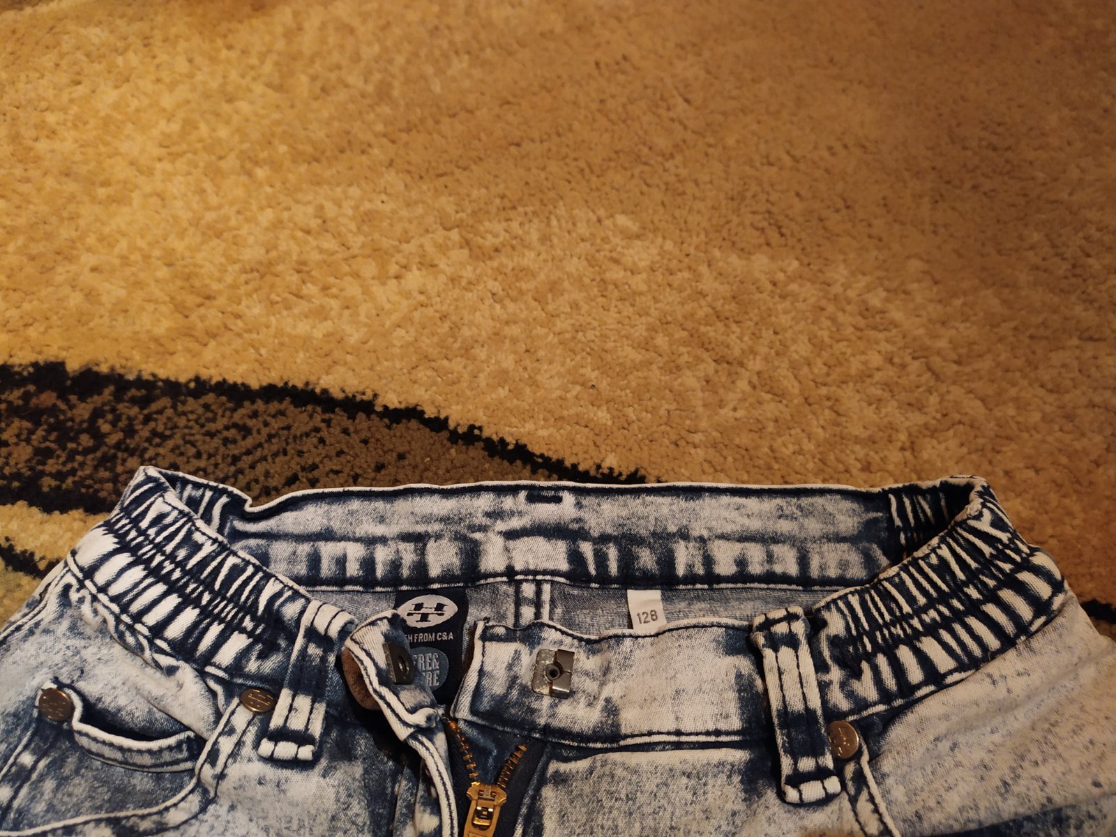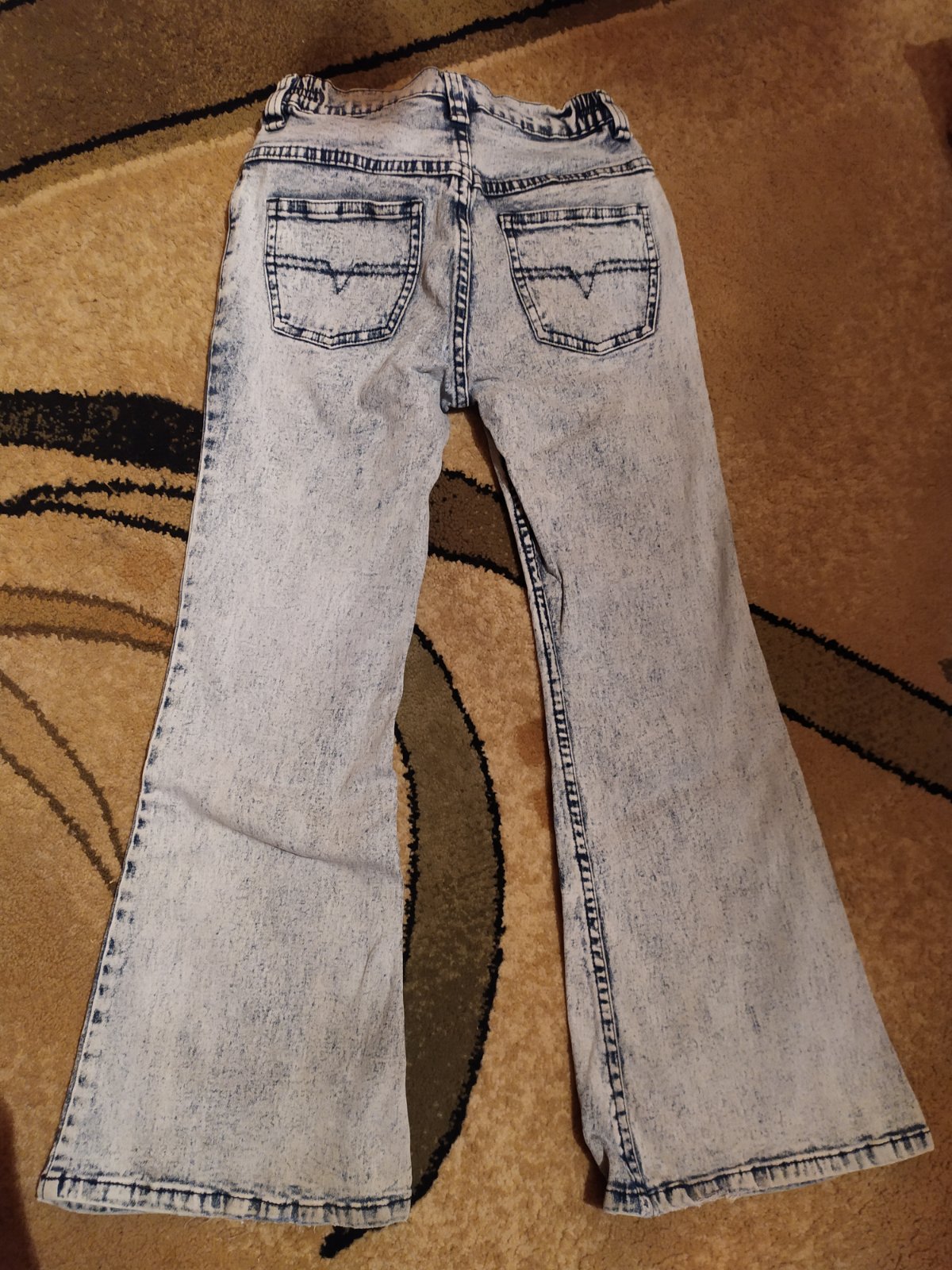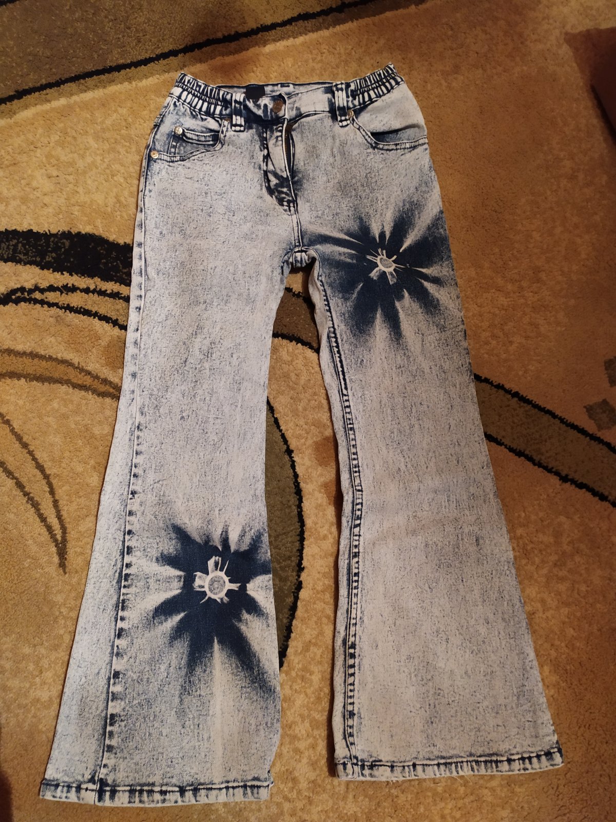 Málo nosené, top stav, zaujímavý netradičný vzor, s gumou v páse. Dĺžka 75cm, od rozkroku 54cm. Pás 27-34cm. Cena s poštou