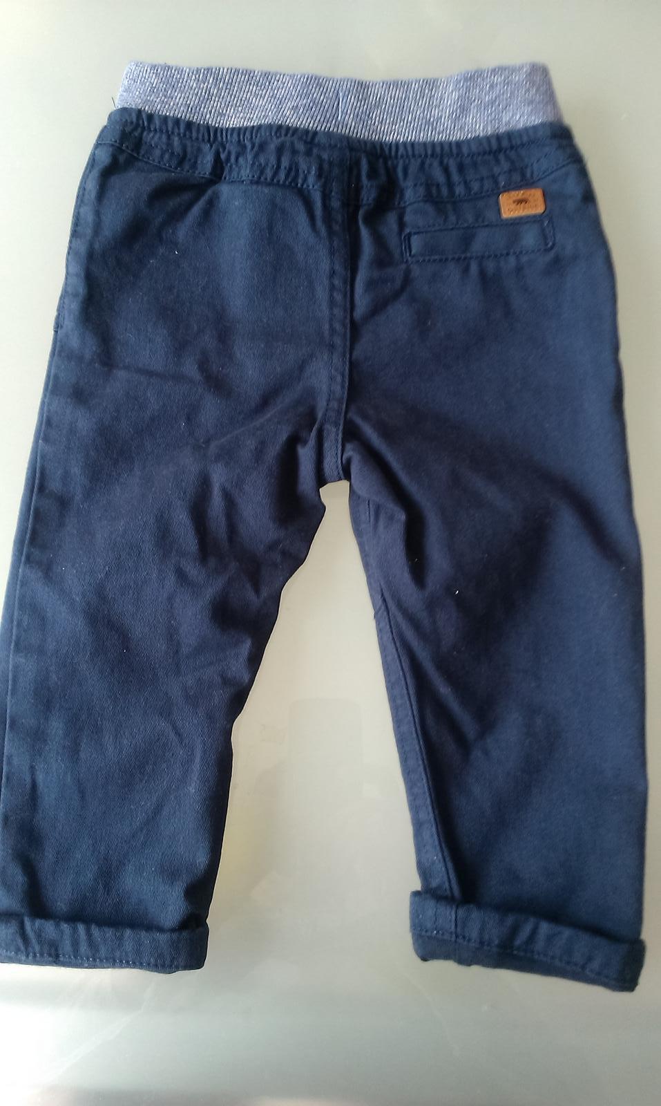 Predám tepláky pre chlapca, veľkosť je písaná 6-9 mesiacov, jemné žmolky, inak bez poškodenia. Sťahovanie v páse - šnúrky. Farba tmavomodrá a sivá