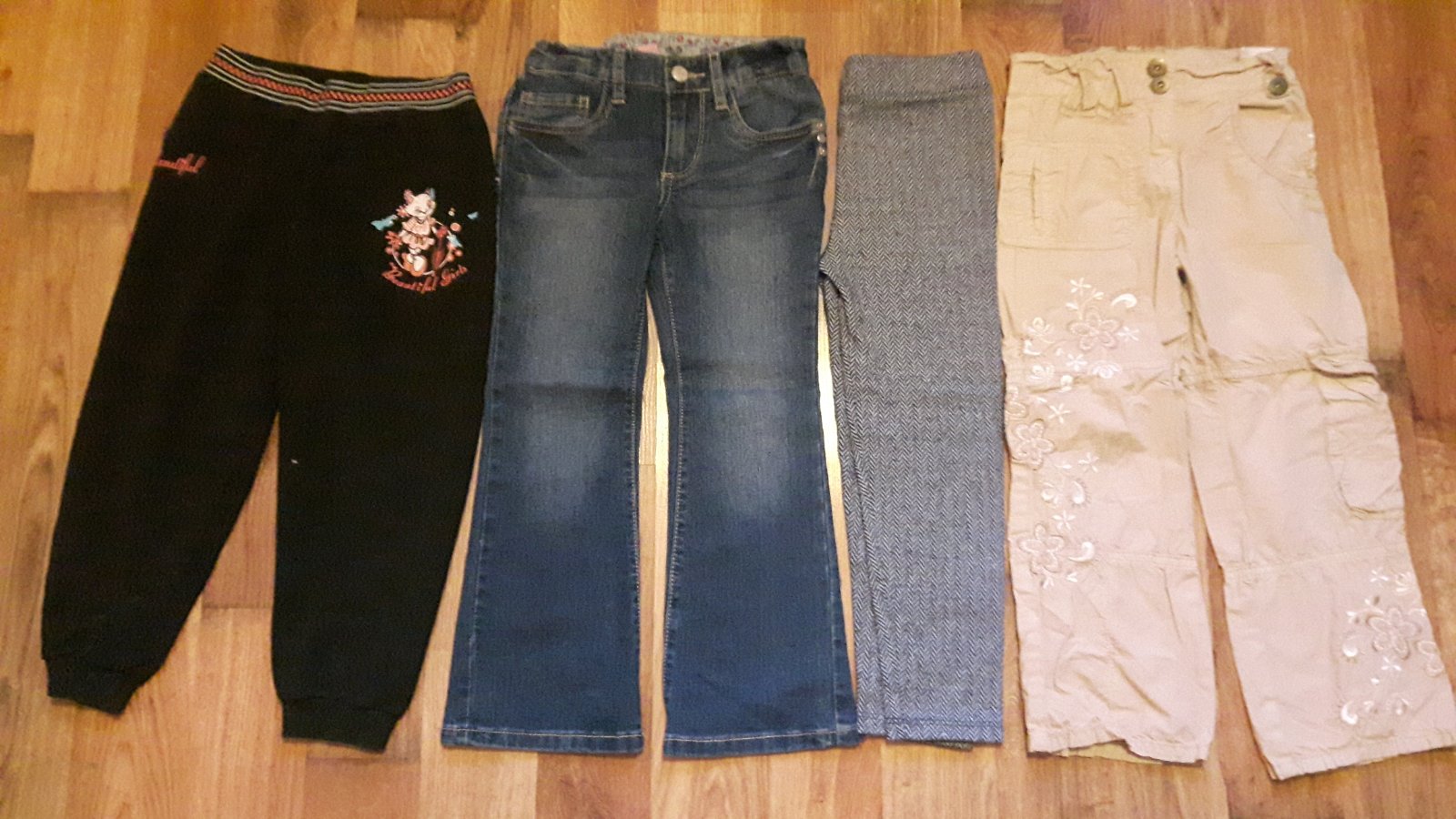 teplaky nalavo dlzka 58cm, vnutorna 41cm , pas 24cmx2 natiahne sa do 28x2- 1,50€, riflove druhe zlava dlzka 63cm, vnutorna 47cmx2, pas 25cmx2 natiahne sa do 27cmx2, -3€cierne tretie zlava dlzka 62cm, vnutorna 43cm,pas 25-28cmx2-3€, bledohnde napravo dlzka 63cm, vnutorna 44cm, pas regulovatelny 26cm-28cmx2-2,50€. spolu 9€