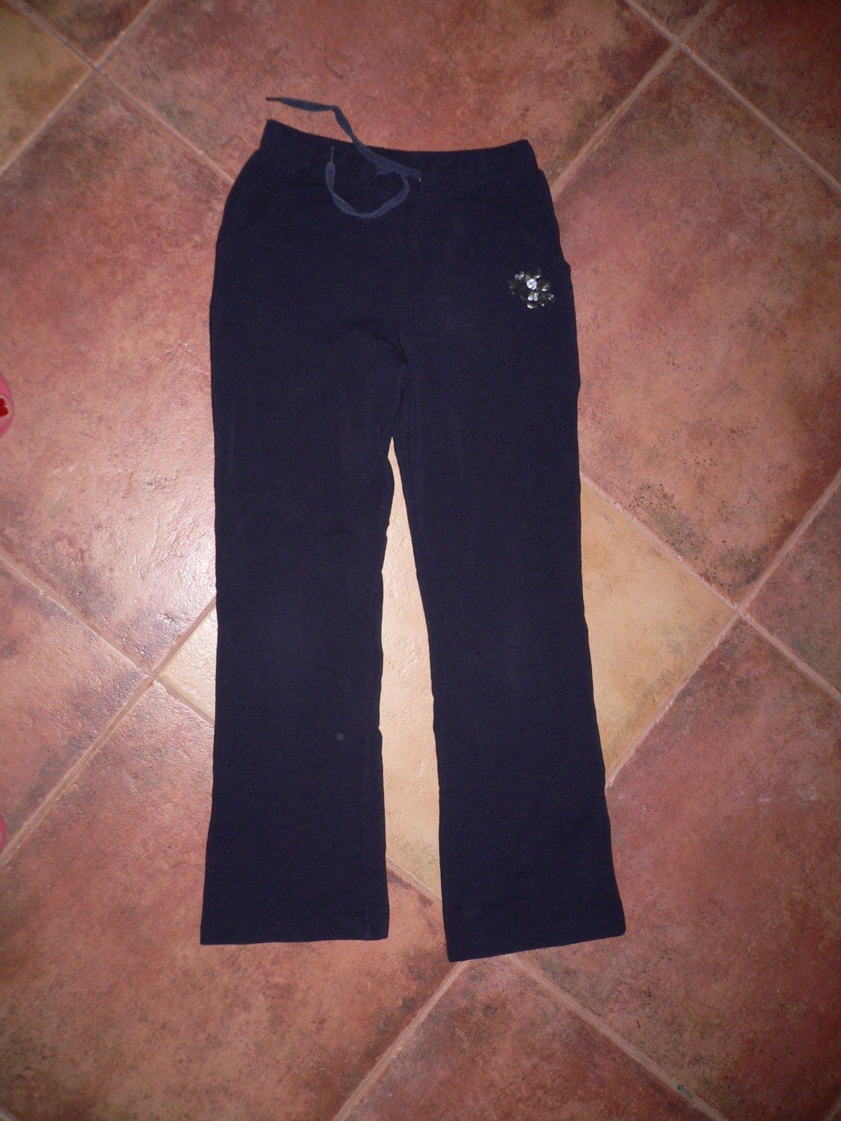 elastické tepláky, málo nosené, vpredu odlepená nálepka kvetiny, vzadu malá zašitá dierka, snažila som sa odfotiť, skoro nevidieť, c.d. 78cm, pás na gumu a sťahovaním 28cm, sed 23cm, vnútorná dĺžka nohavice 58cm, cena 2€ + pošta