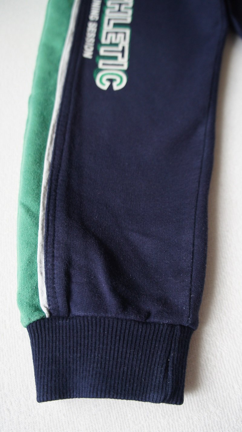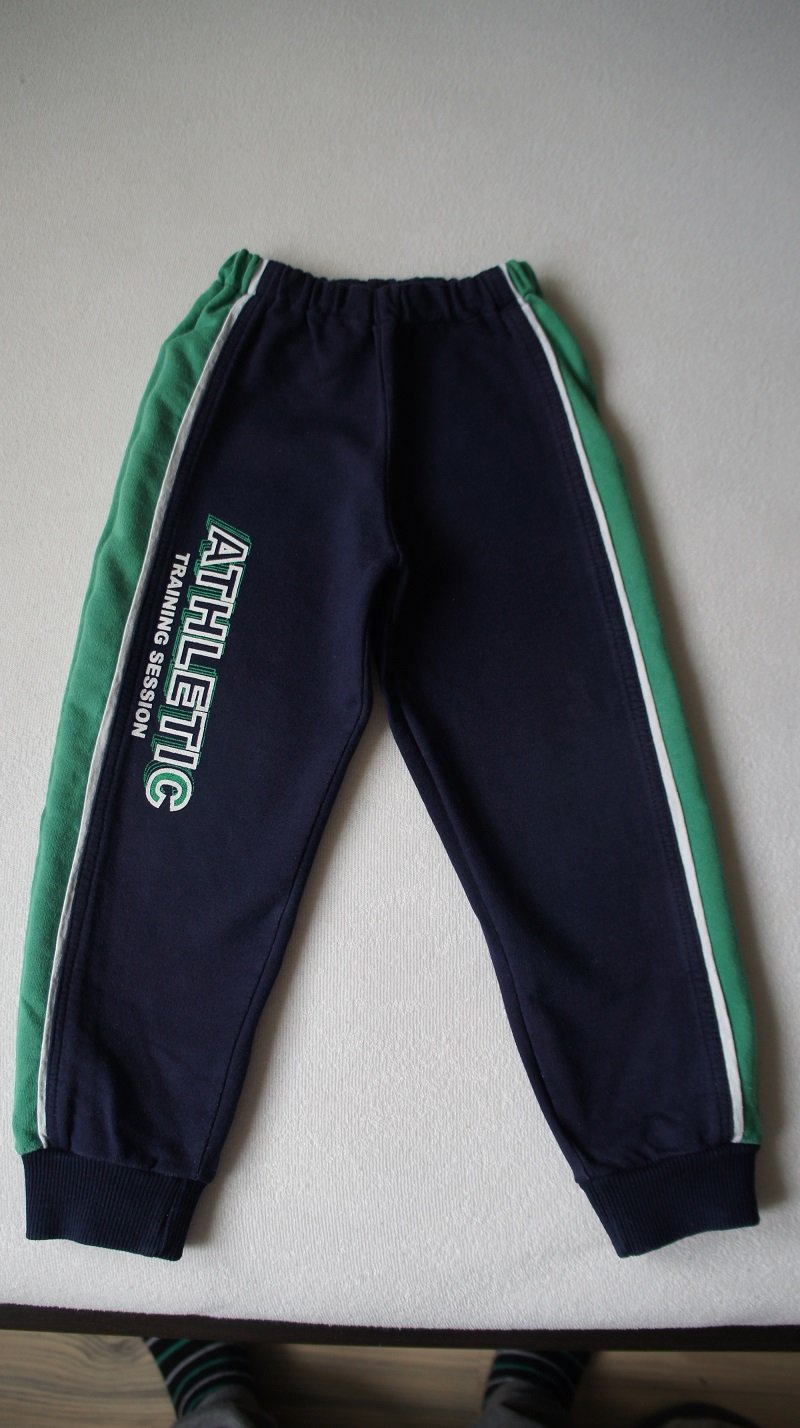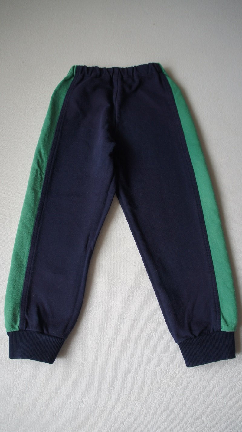 Tmavomodné so zelenými pásikmi po bokoch, veľ. 96, zn. Happy (SK), bez vreciek. Oproti ostatným teplákom sú tieto také užšie (cca o 2 cm). Nosené, tenšie, bez poškodení.