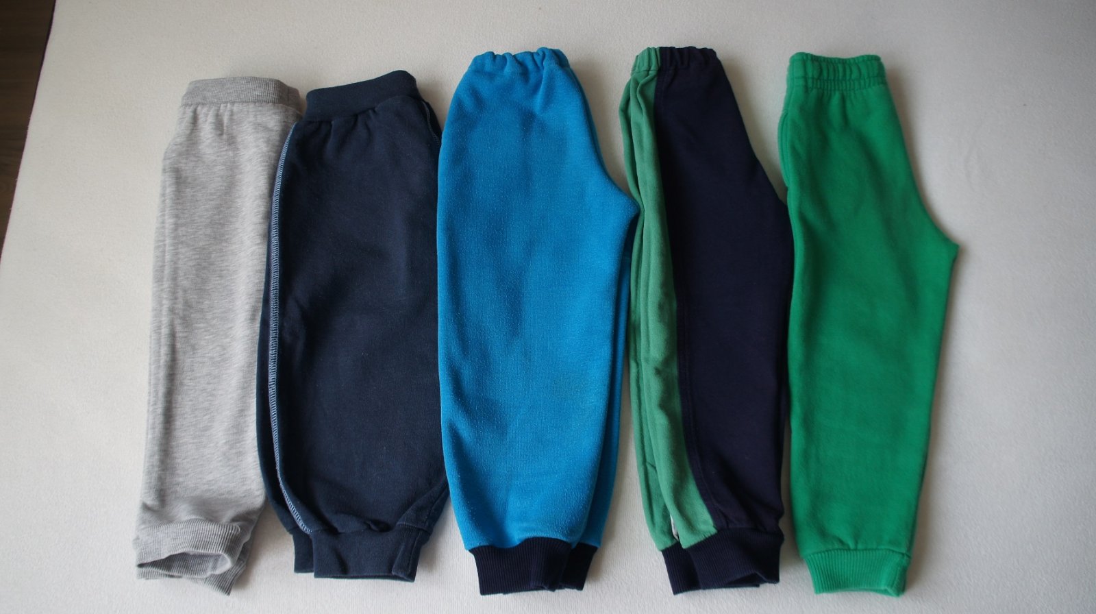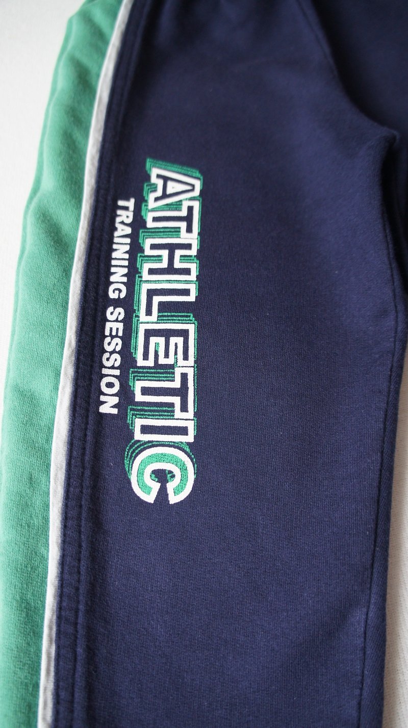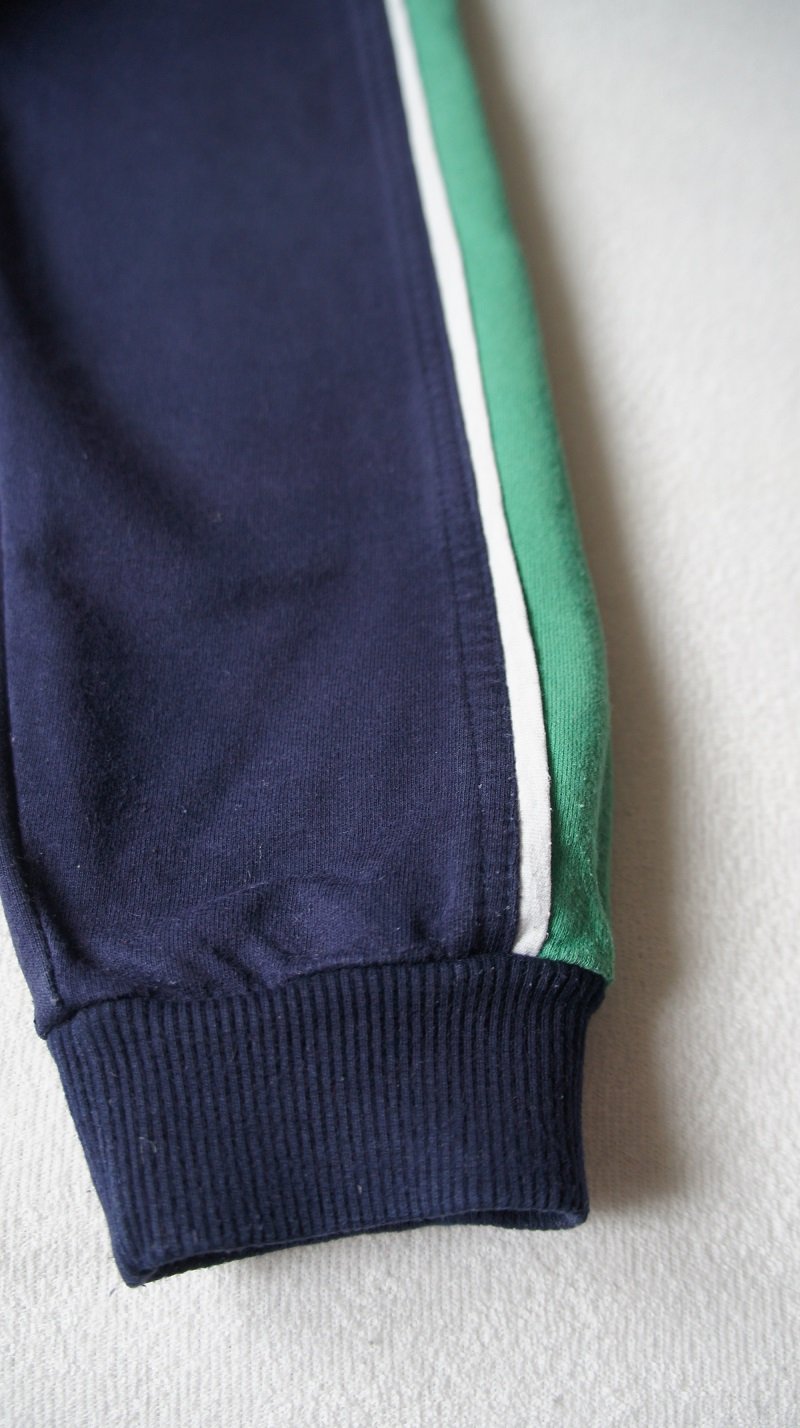 Tmavomodné so zelenými pásikmi po bokoch, veľ. 96, zn. Happy (SK), bez vreciek. Oproti ostatným teplákom sú tieto také užšie (cca o 2 cm). Nosené, tenšie, bez poškodení.