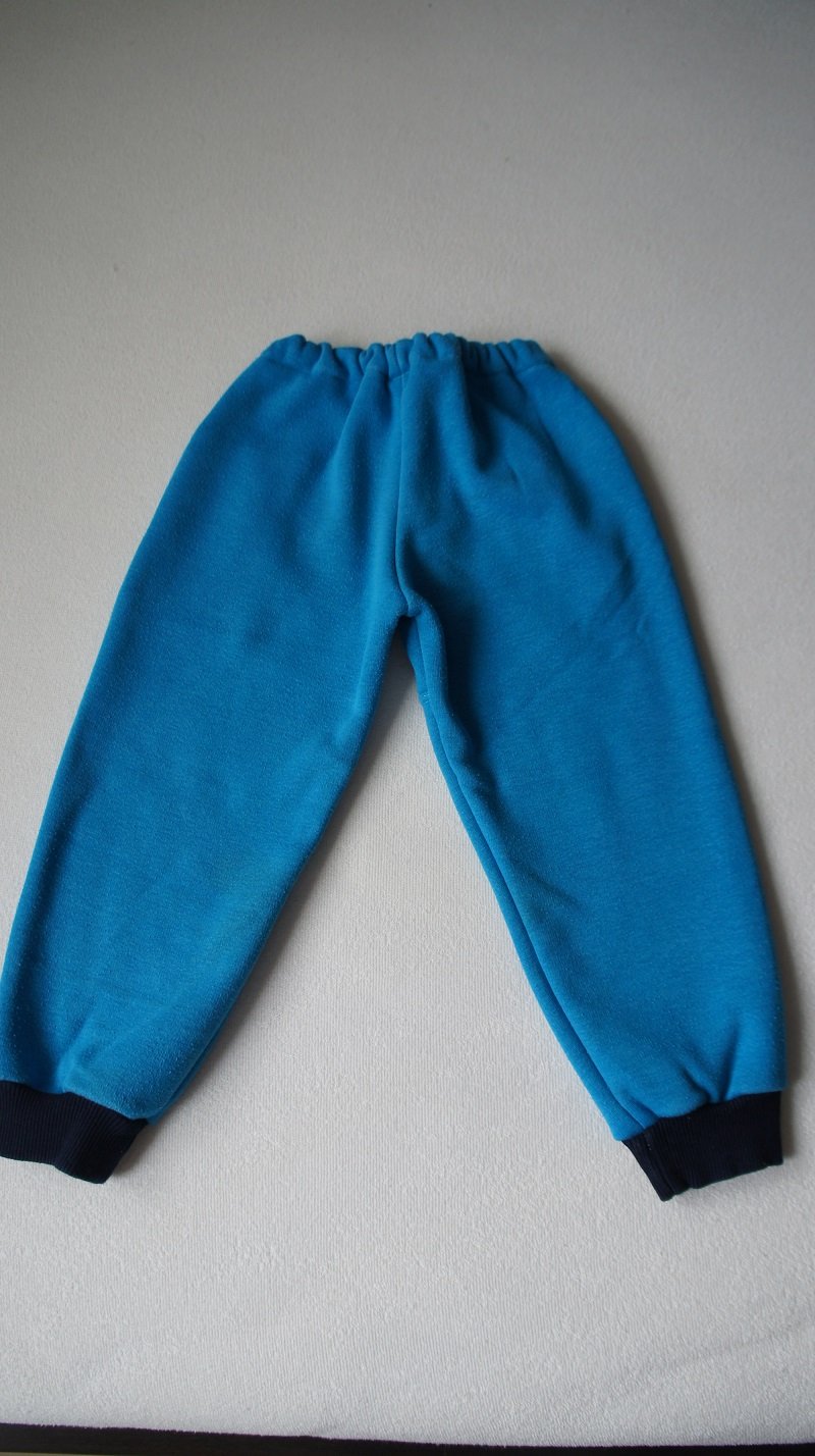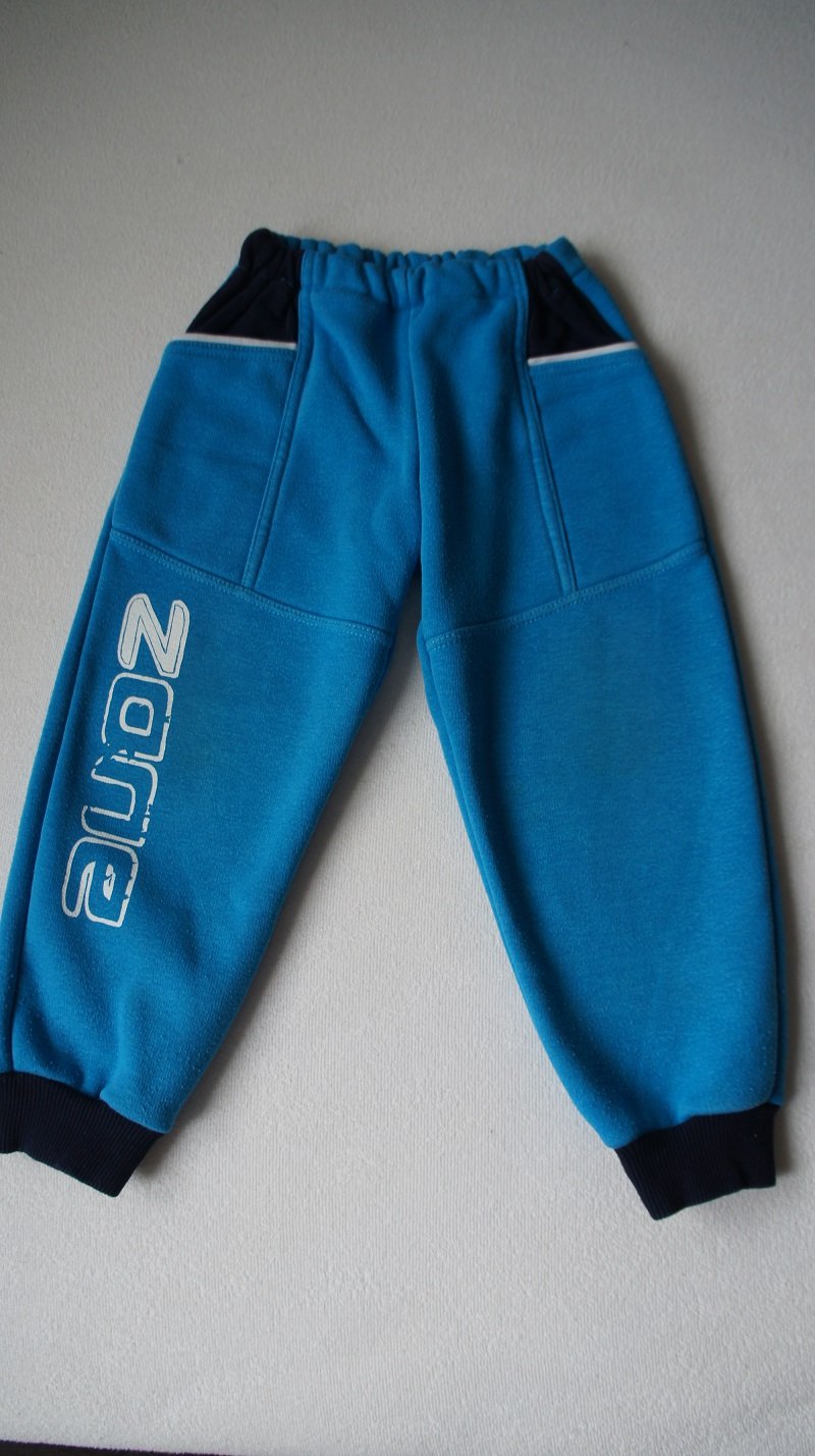 Tyrkysové, veľ. 92, zn. Happy (SK), 2 vrecká vpredu, hrubšie, teplučké. Nosené aj von, žmolky, bez dier či fľakov, pri podrobnom skúmaní možno trochu vyšúchanejšie kolená od padania a následného prania.