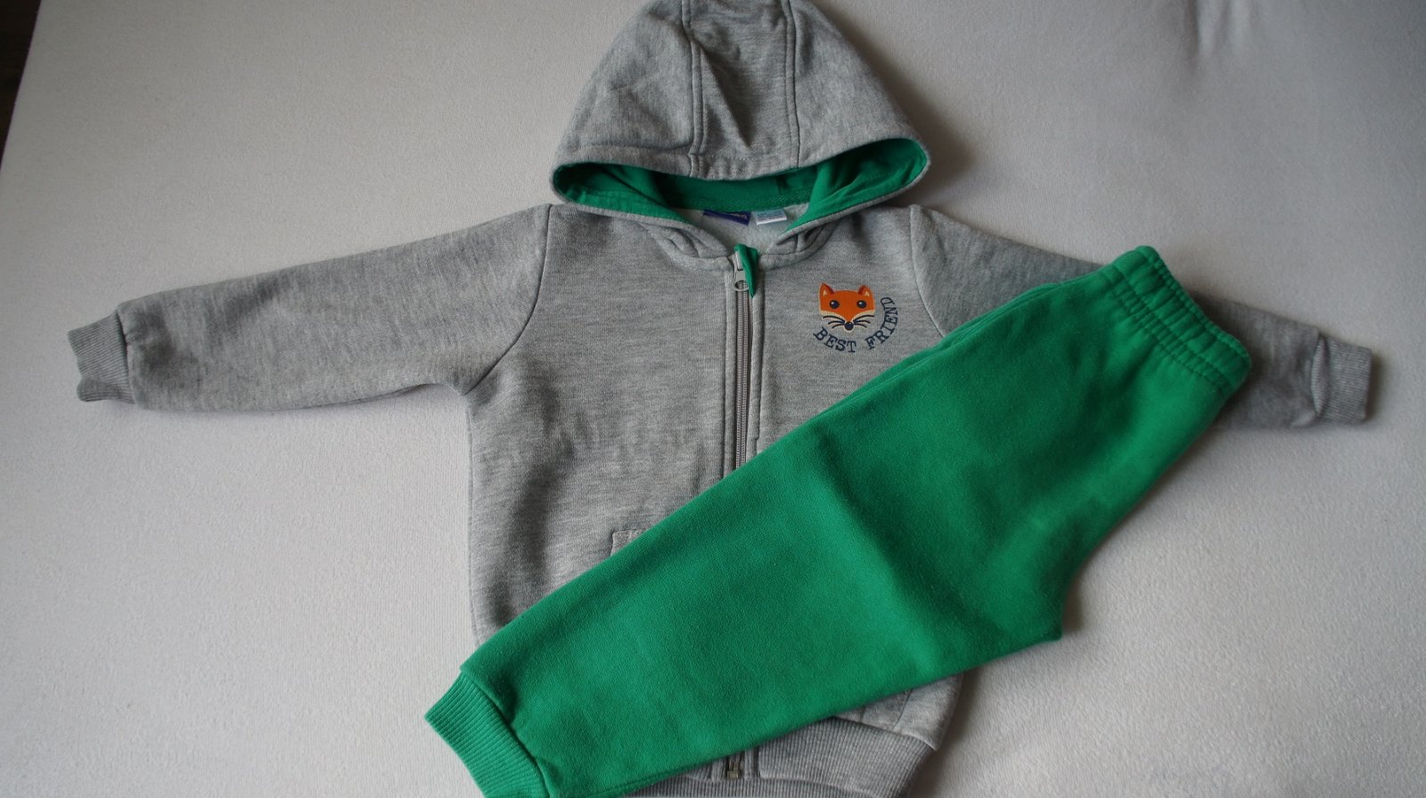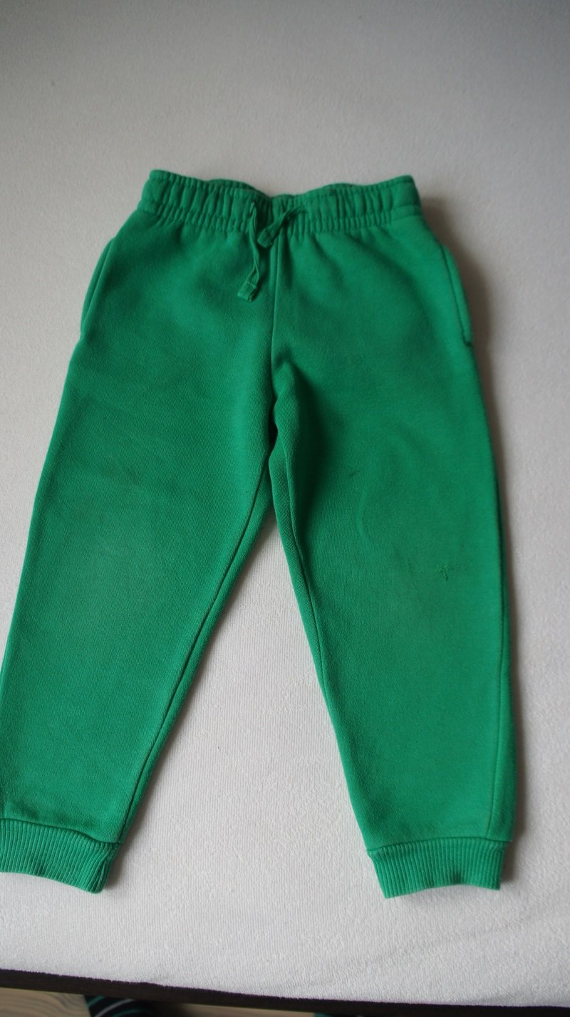 Zelené, veľ. 86/92, zn. Lupilu, funkčná šnúrka, 2 vrecká. stredne hrubé. Nosené, zašitá dierka na kolienku, 2 mini fliačiky. Bola to súprava, k dispozícii šedá mikina k tomu.