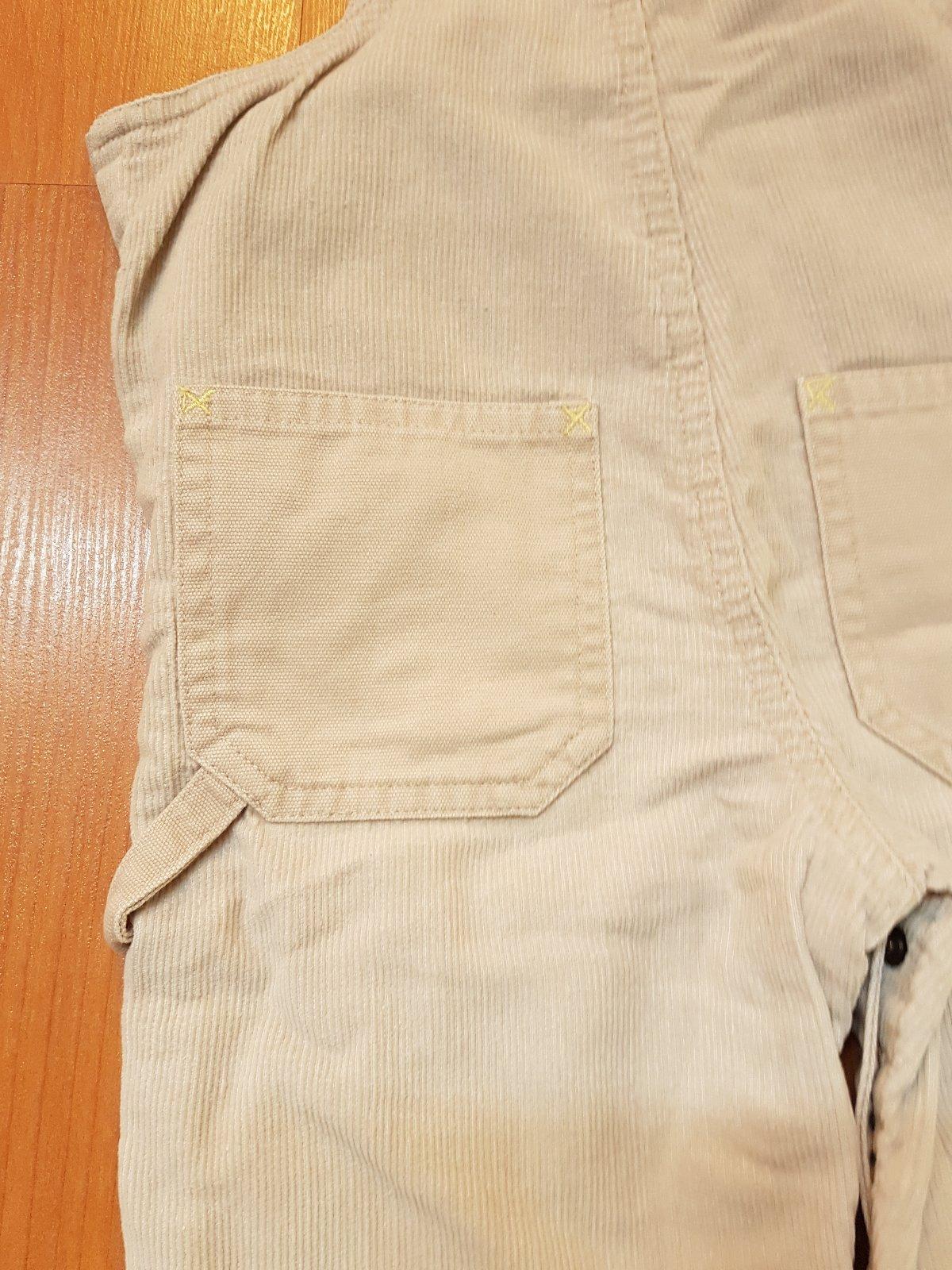 minimalne nosene nohavice na traky. nastavitelne traky. maju nasite aplikacie - vrrcka v bezovej riflovine.