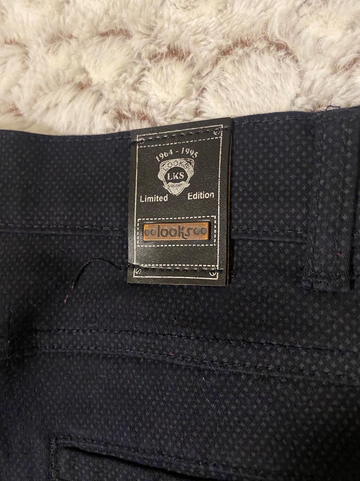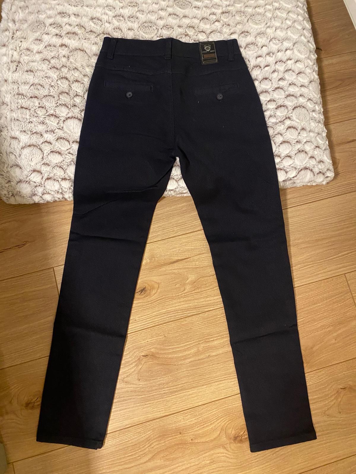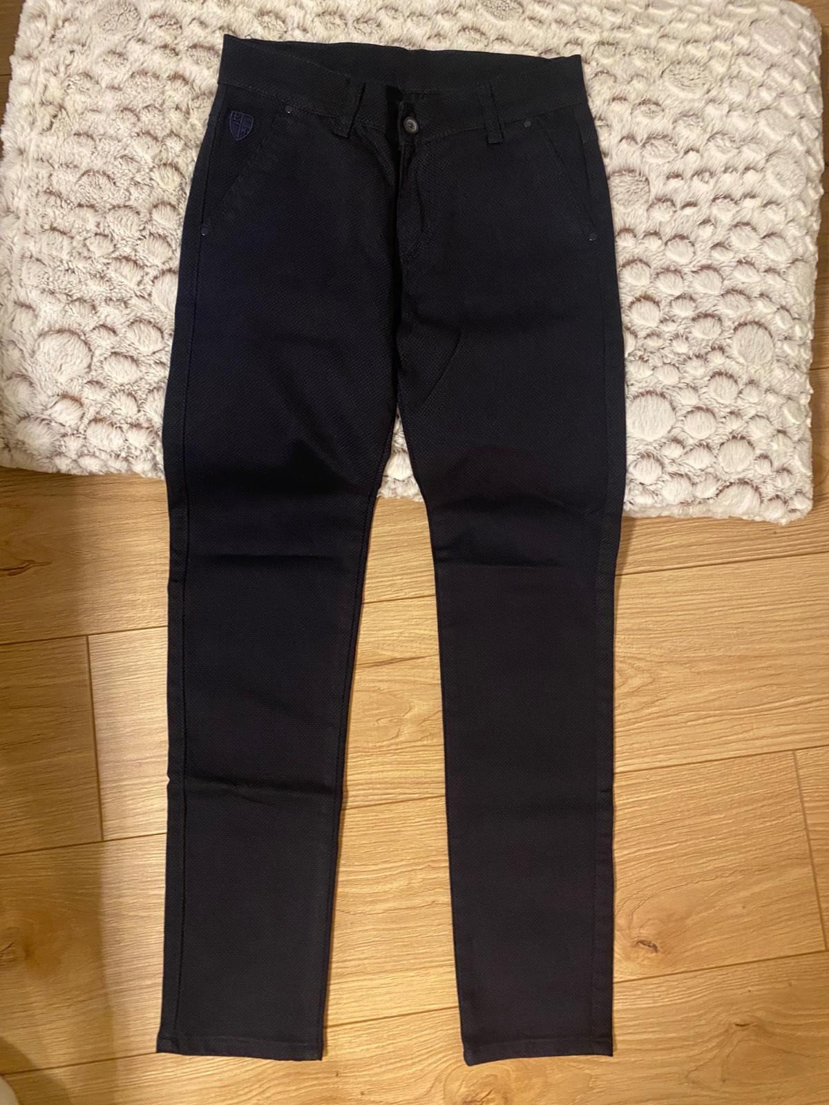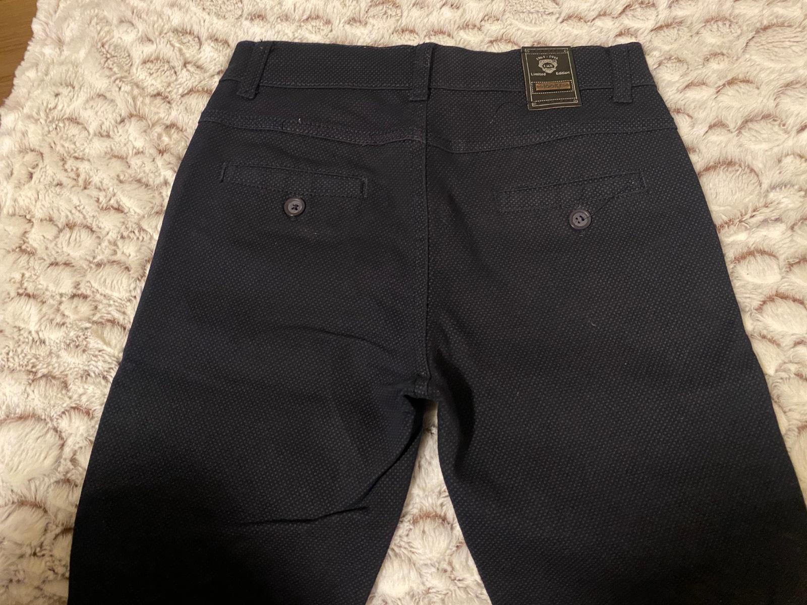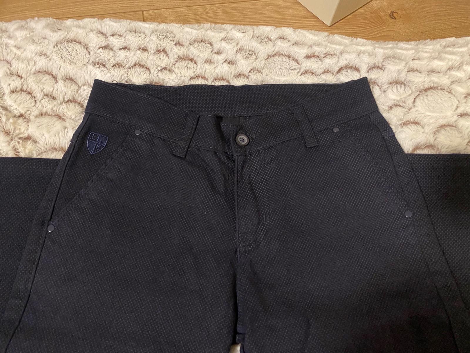 Tmavomodré nohavice chlapčenské. Sú na telo take “oblekové”. Oblečené len raz na svadbu. pas; 71cm, dĺžka od pásu: 93,5cm, od rozkroku: 72m, šírka v lýtkach: 33,5 cm 🙂