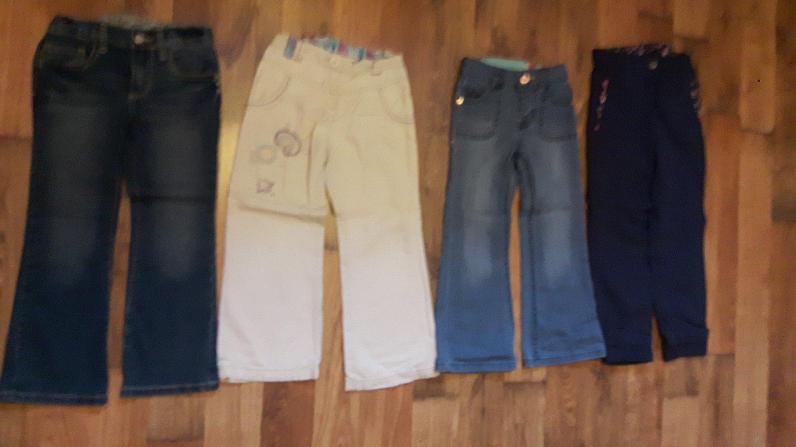 vsetky su tak 110-116. rifle nalavo velkost 110)6 dlzka 64cm, pas 24cmx2 regulovatelny cena 2€, kremove druhe zlava ladybord dlzka 62cm, pas 25-28cmx2 regulovatelny cena 3€. tretie rifle zlava dlzka 62cm, pas 25cmx2 regulovatelny cena 2€, tmavomodre vpravo len oprane kikikoko 116. dlzka 66cm, pas 26-28cmx2 regulovatelny cena 5€. spolu 9€
