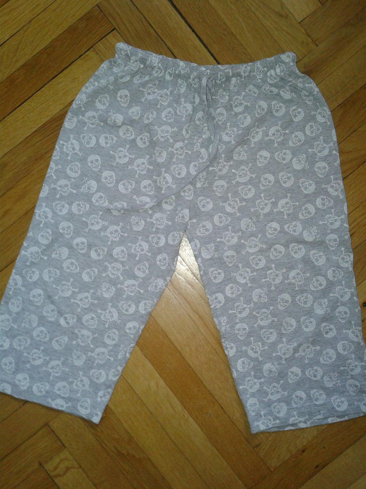 3/4 tenké bavlnené tepláčiky s lebkami, alebo ako pyžamové nohavice na donosenie. Veľkosť odhadom štítok som nenašla. Pás 25 cm x2 , dĺžka 51 cm , dl. nožky od rozkroku 31 cm . Tričko zn. Next na donosenie má dierku viď foto. Miery dl. 41 cm, šírka 37 cm. Cena spolu