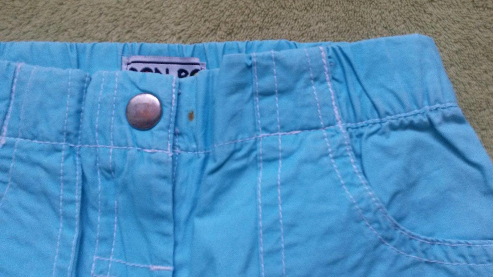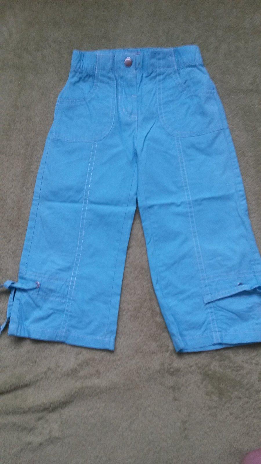 Diečenské, pekné, zachovalé, športové nohavice, letnej tyrkysovej farby s bielym štepovaním. V pás v gume. Pri gombíku na opasku malý fliačik , zohľadnené v cene. PD 2x naštepované vrecká ZD vrecká vybité kružkovými cvokmi. Pekný stav- nepoškodené.