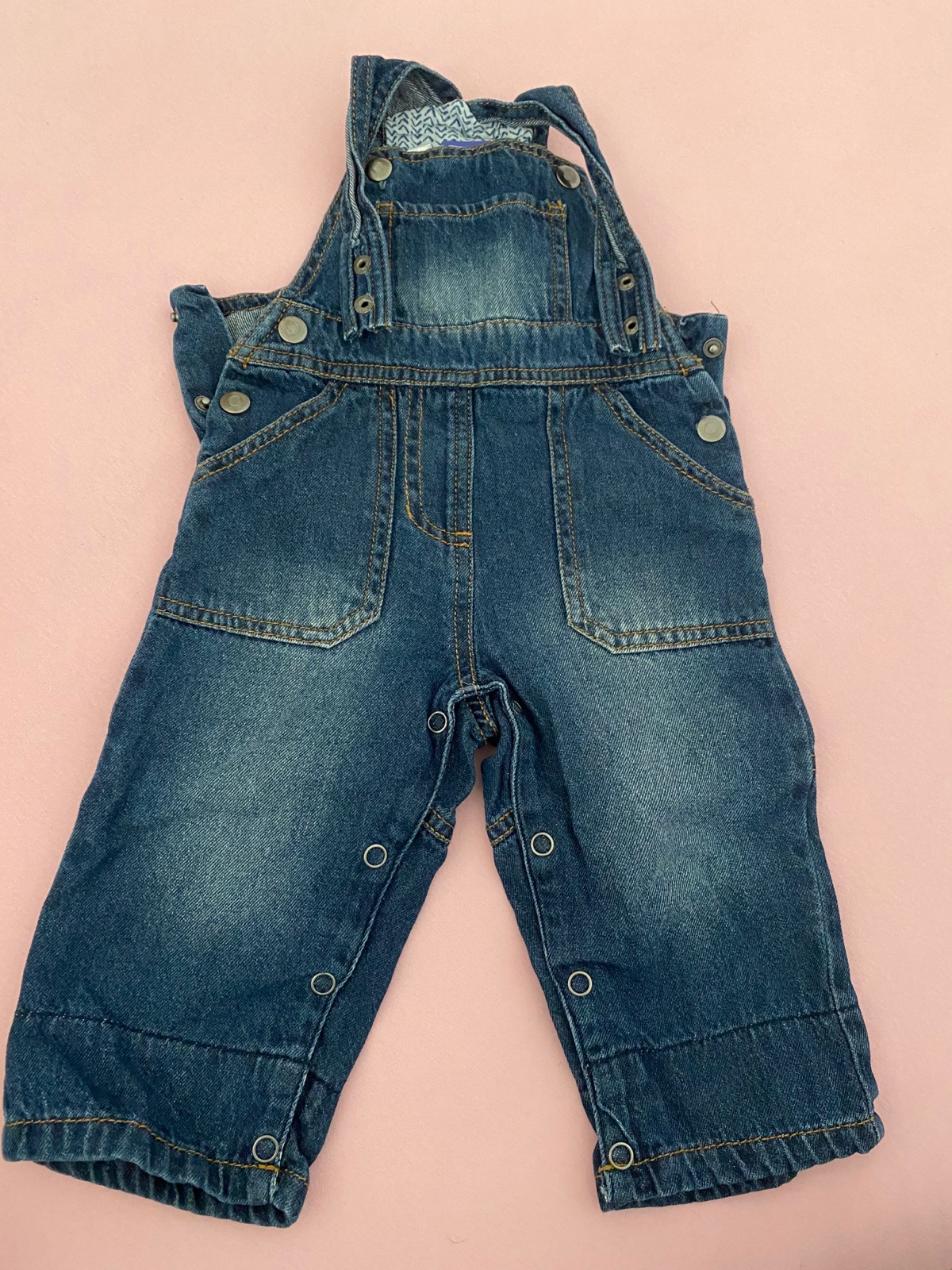 Chlapčenské rifliky na traky, veľkosť 68, s moderným ošúchaným vzhľadom, na rozopínanie pre ľahké prebaľovanie, traky sú nastaviteľné, po bokoch cvoky, spodok nohavíc sa dá zahnúť vidno pekný štvor...