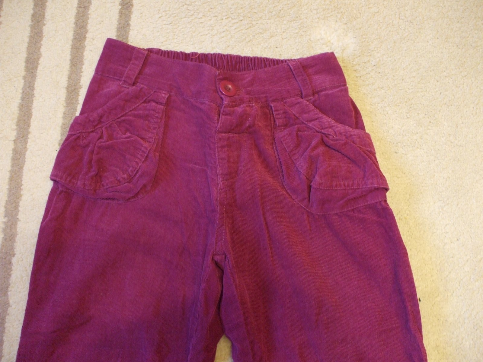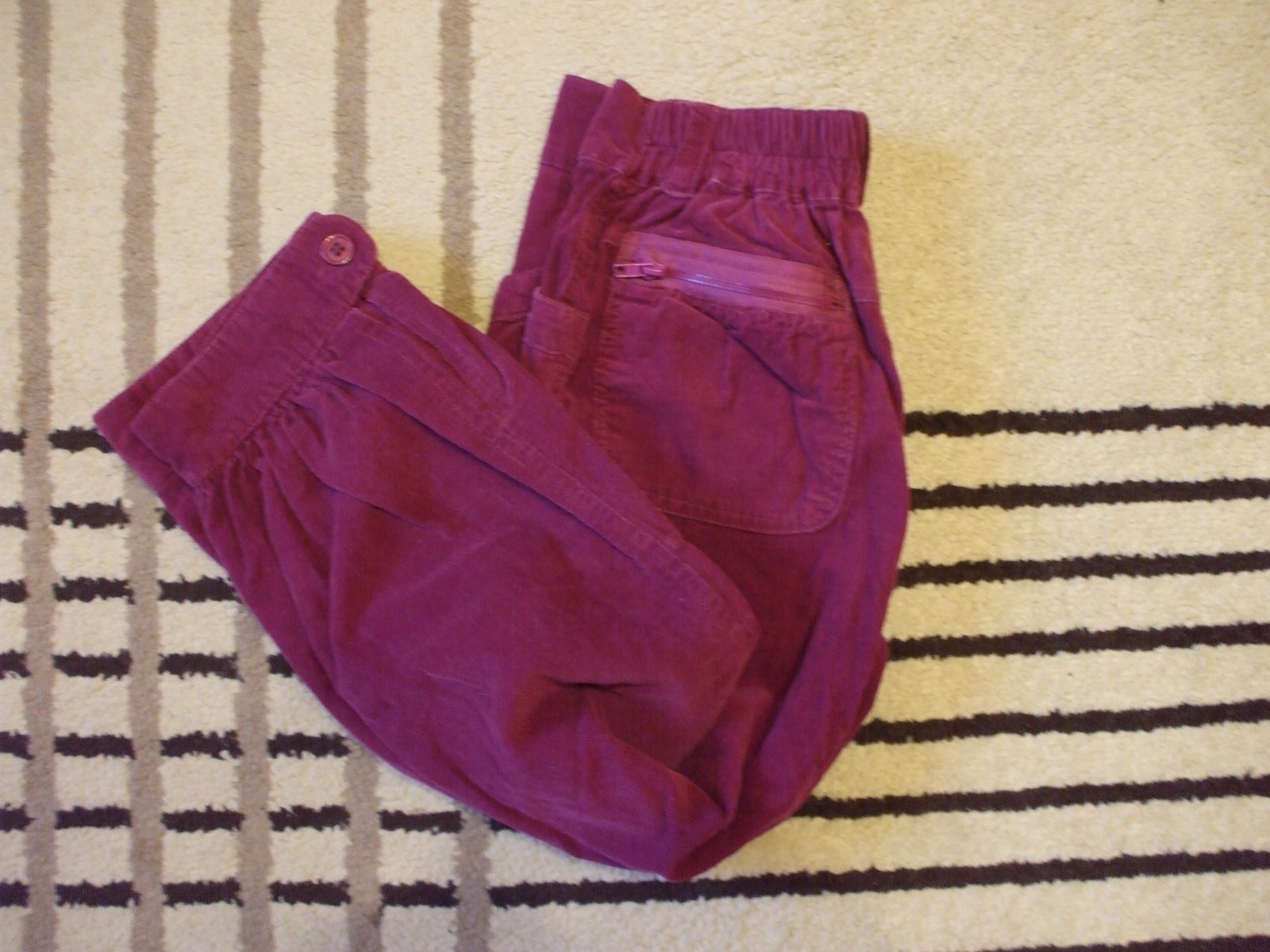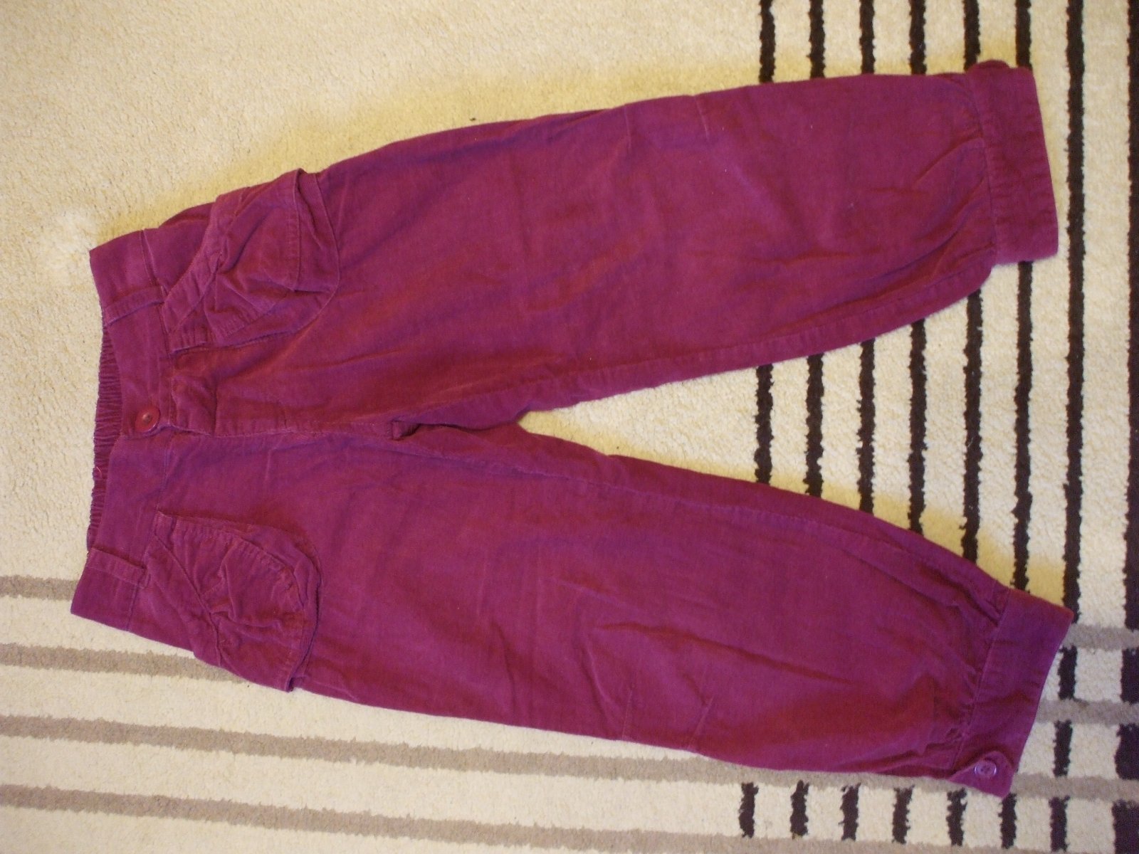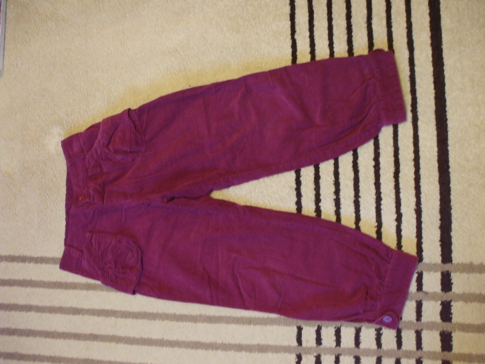 Krásne trojštvrťové nohavice na pančušky (nie letné). Sú kordové, veľmi peknej fialovej farby, nepodarilo sa mi ju poriadne odfotiť.