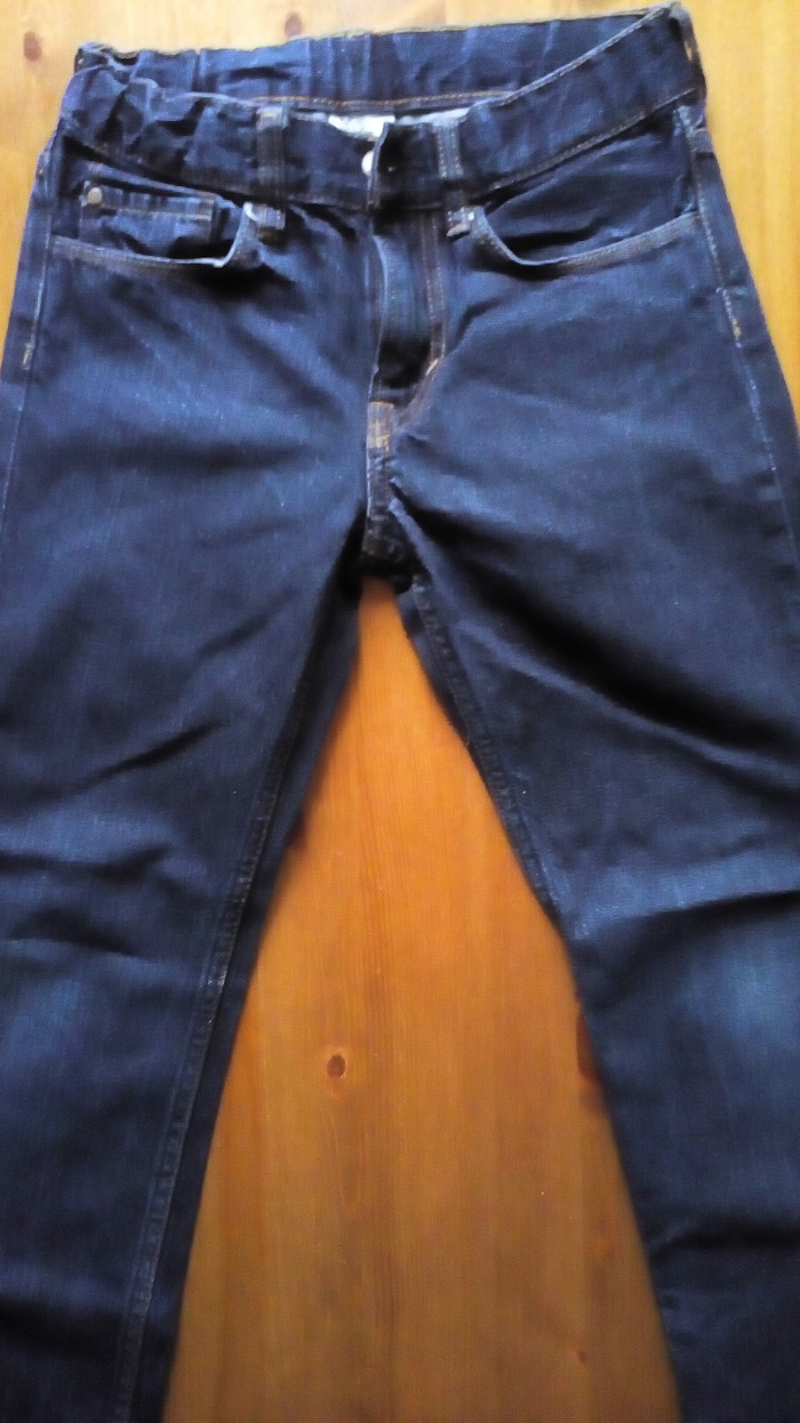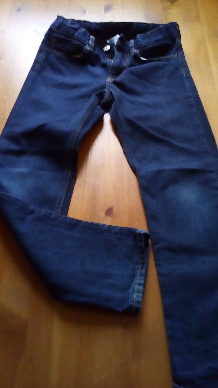 predám veľmi pekné džínsy tmavšieho odtieňa modrej farby, vo veľmi dobrom stave, neošúchané nosením, ale výrobným procesom. Kolená nie sú vydraté ani vyšúchané. Odev je bez poškodenia a znečistenia. Materál mäkký a poddajný, praním získal svoje výhody pri nosení.