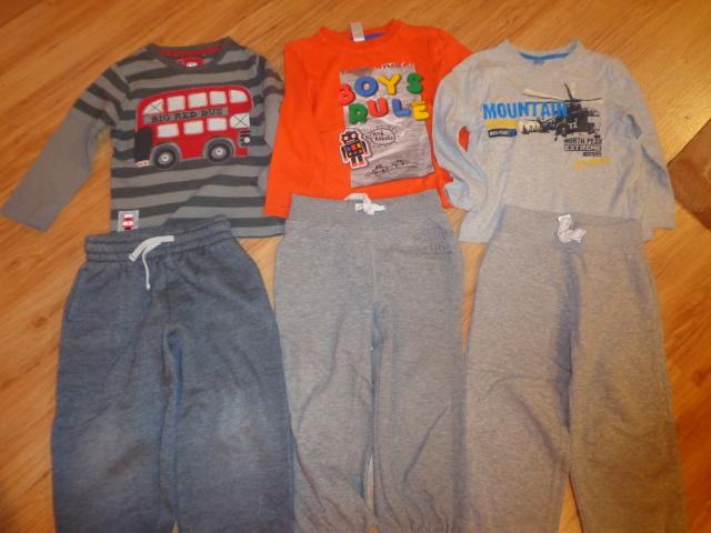 Tepláky tmavo šedé prvé zľava: značka Matalan, Uk, veľkosť uvedená 4-5, no je to naša 104, nosenie je vidieť už na kolienkach sú bledšie. Sú vyteplené, cena: 2 Eur. Dĺžka: 56 cm