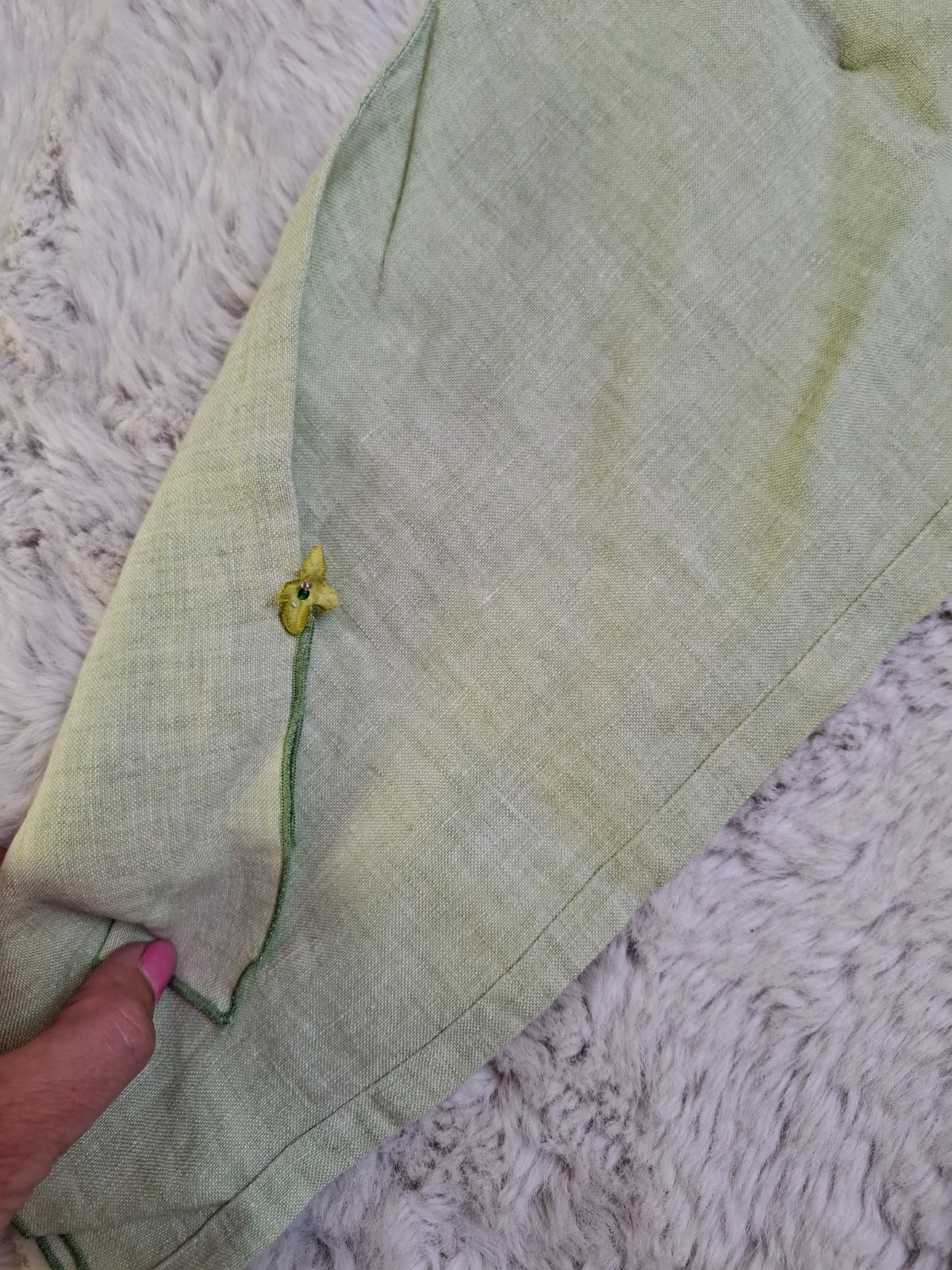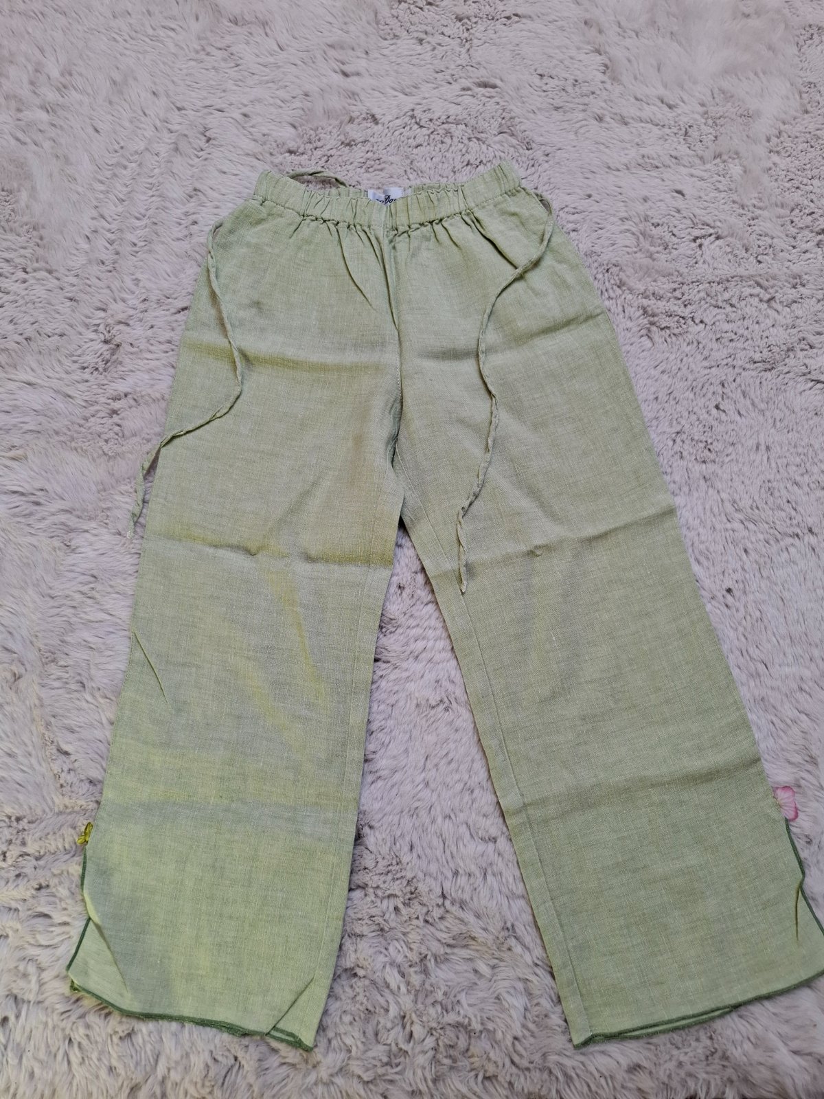 nosene lanove, lahke nohavice, velkost davam odhadom 116, na spodku rozparky, na jednej strane chyba kvietok, darujem k inému nákupu