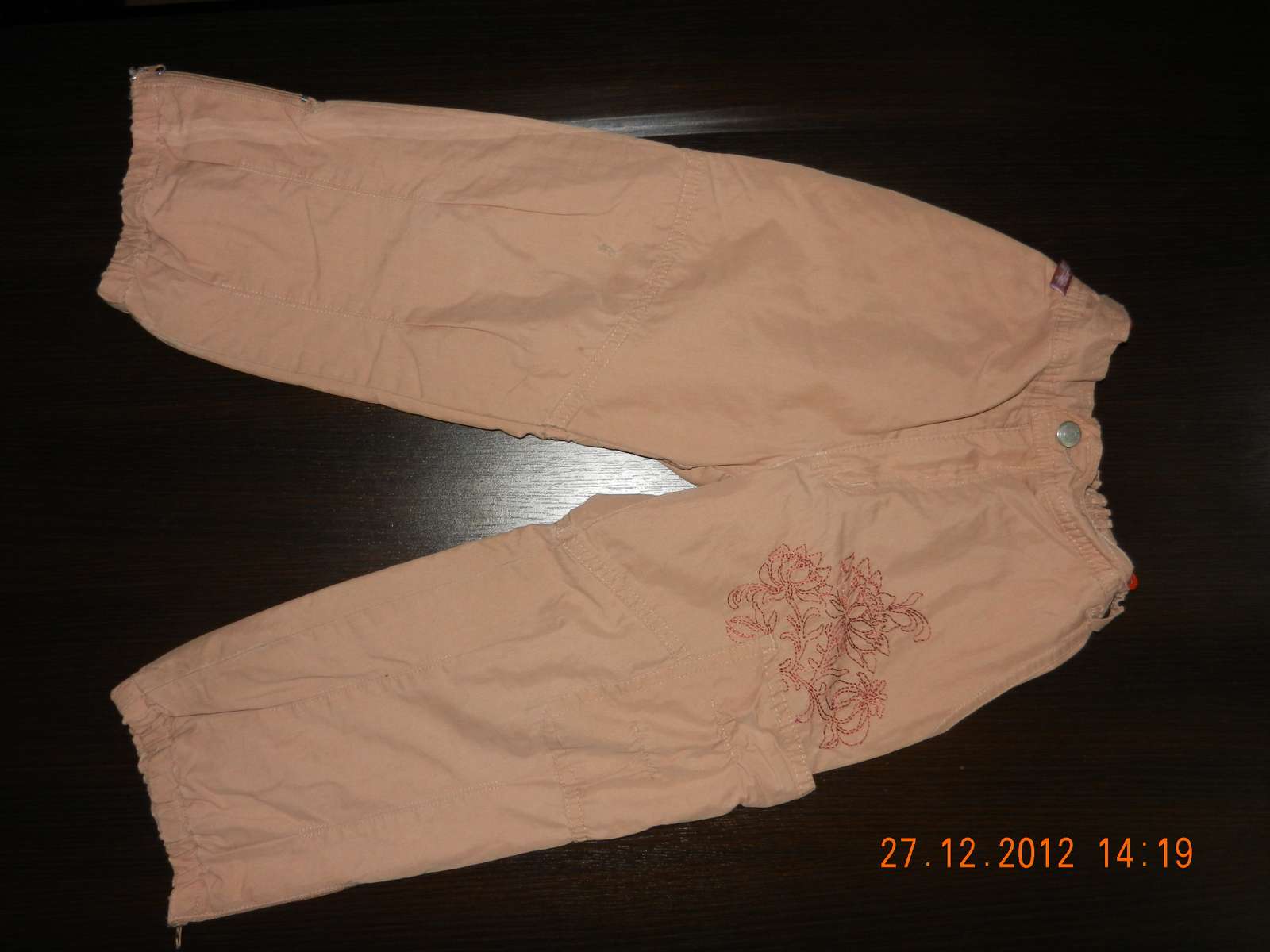 podsite, bez flakov, regulovatelny pas, dolu na nohaviciach zipsy. 3 vrecka. na kolienku sa uz trosku vydrala latka, nie diera, vzadu je akokeby vytiahnute nitky,alebo zadrate, tiez len na kusocku, neda sa to ani je to asi na 1cm. regulovatelny pas.