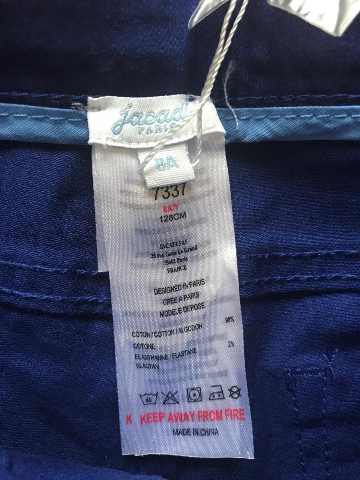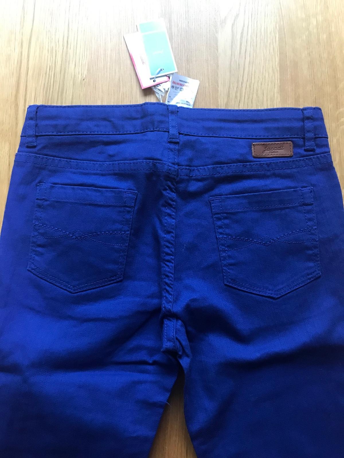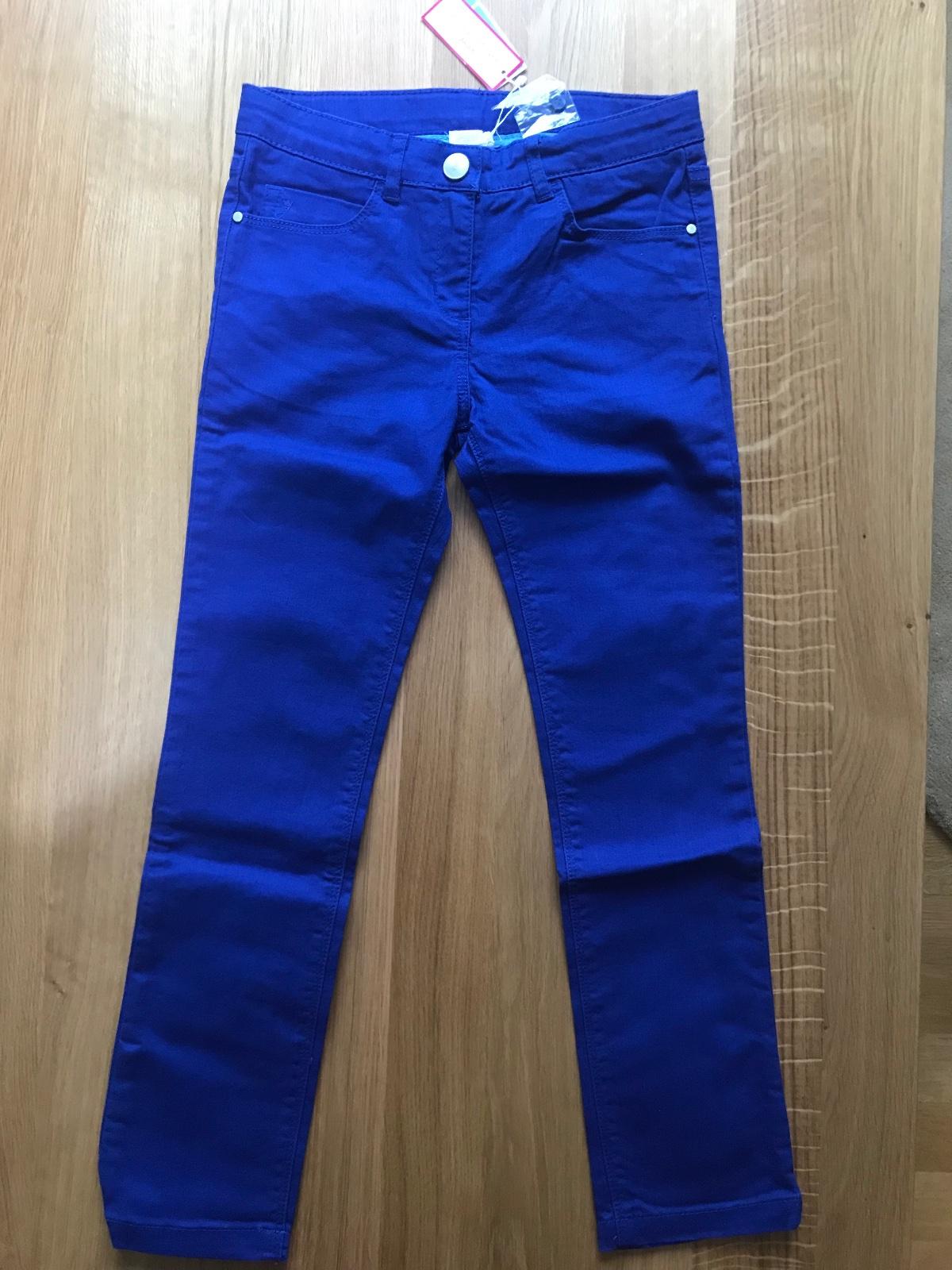 Bavlnené nohavice parížsko modrej farby sú nenosené. Majú výborný užší strih s regulovateľným pásom, veľmi pekne sedia na detskej postave, kupujeme rovnaké každý rok v rôznych farbách.