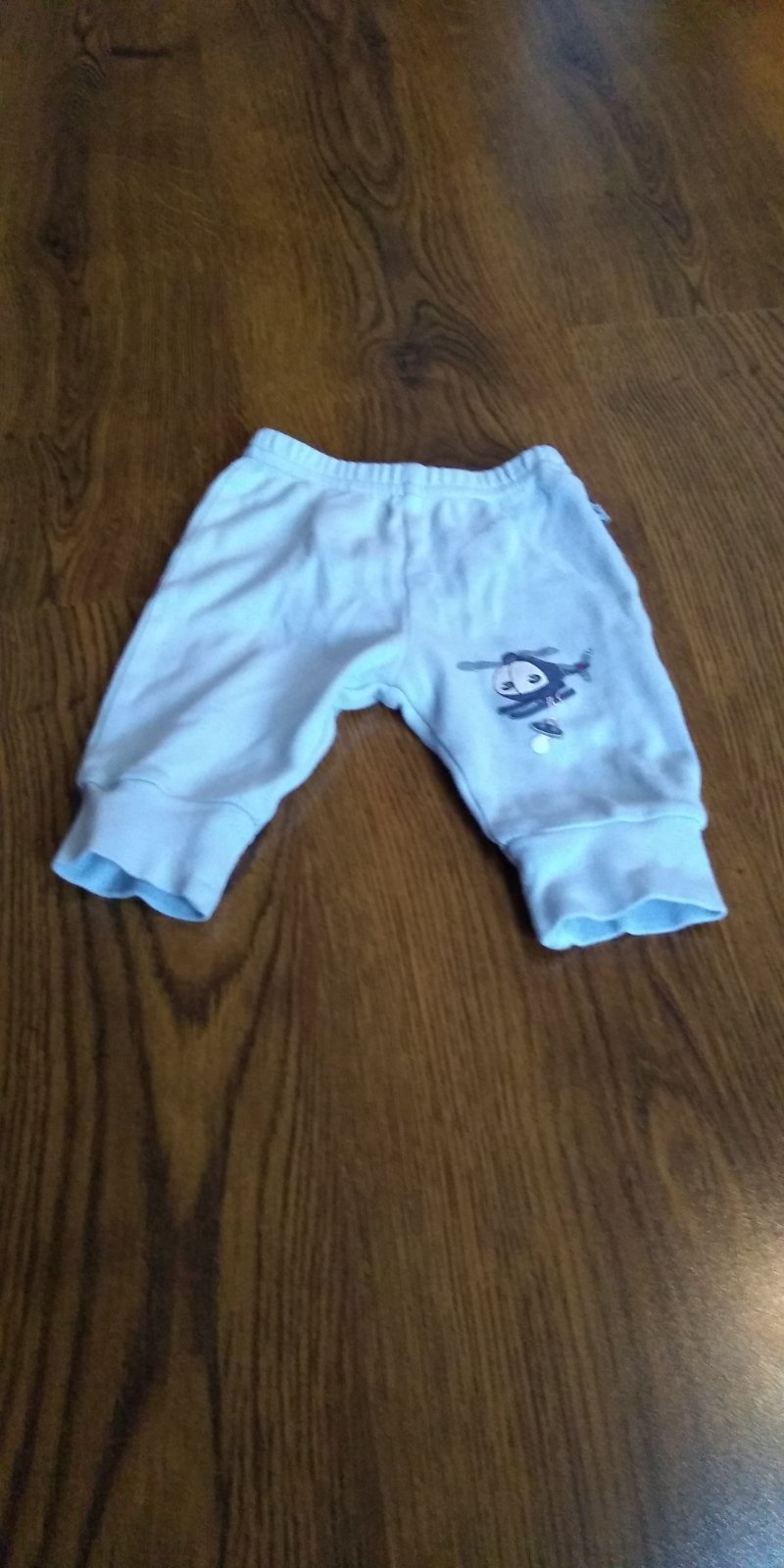 Dvoje teplaciky next, up to 3months, 6kg. Vidno nosenie, mala dierka aj na spodnej časti zo zadnej strany - foto. Pri nosení nie je vidno dierka.