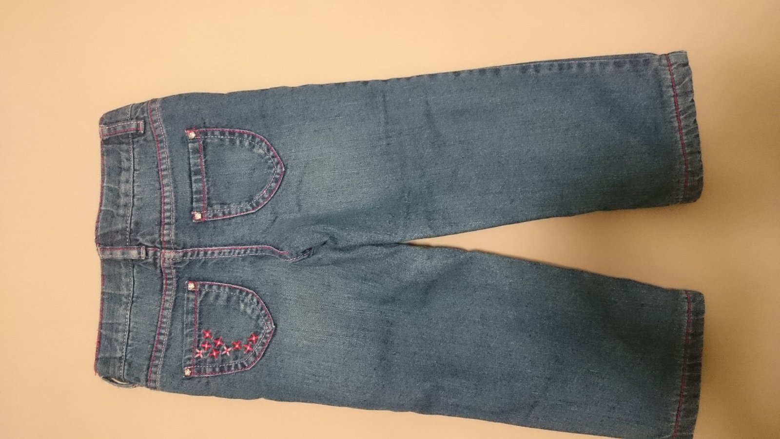 Zateplené rifle značky Tchibo, veľkosť 98/104, s nastaviteľným pásmom, cyklámenovým futrom, na zadnom vrecúšku s výšivkou drobných kvietkov.