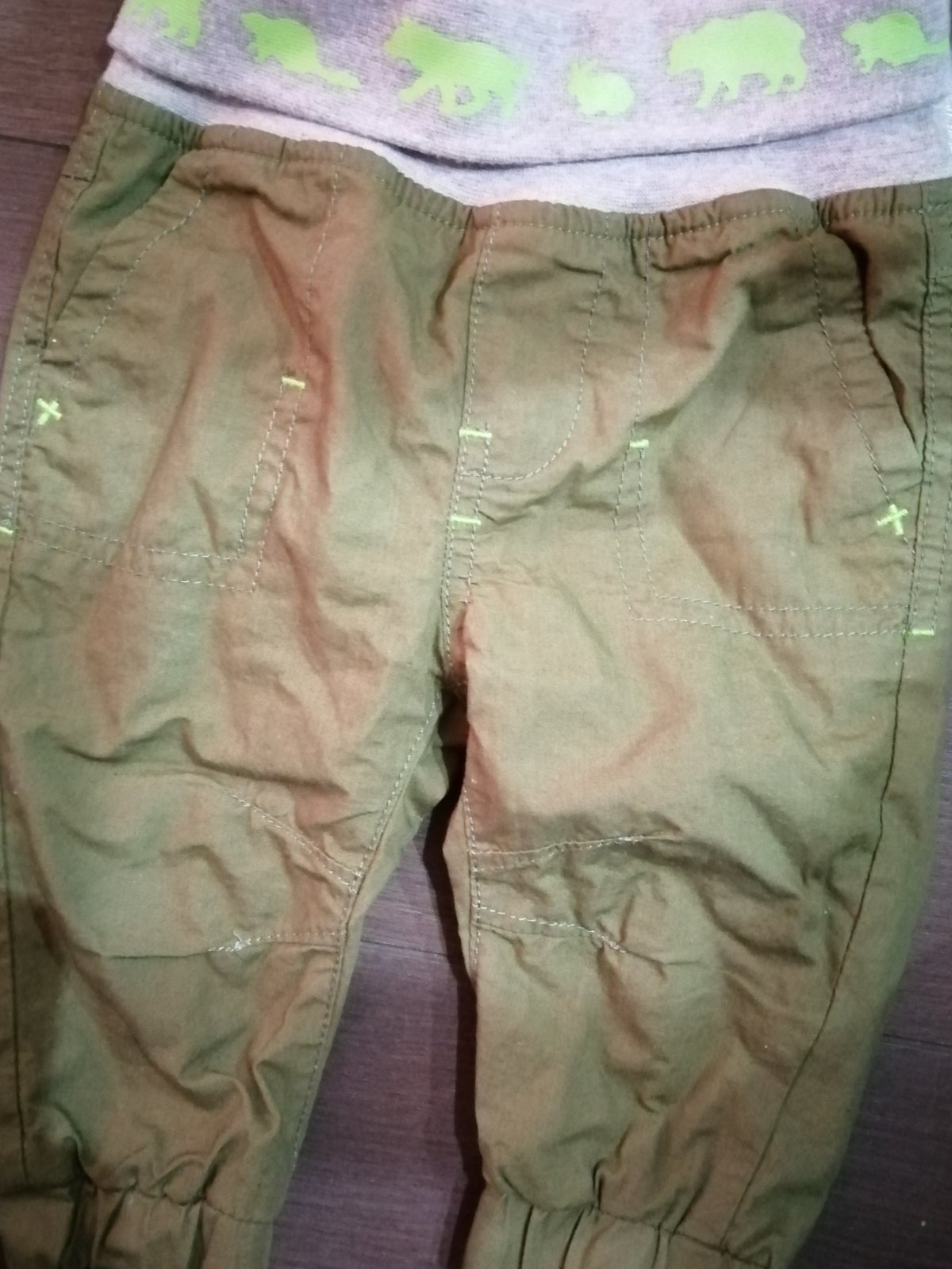 Menčestrové nohavice peknej hnedej farby so ozdobným štepovaním a širokým pásom. Podšité modrou bavlnenou látkou. Minimálne nosené, ako nové, nepoškodené. Top stav. Veľkosť uvedená na štítku: 62 ...