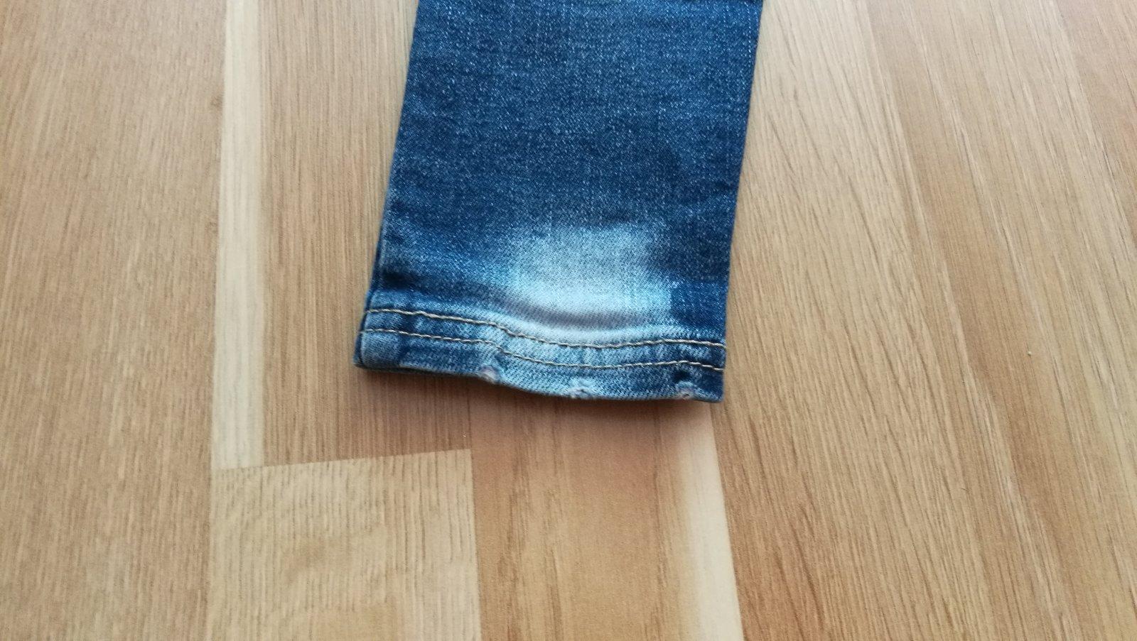 Nosené, na ľavom kolene menší žltý fliačik, skoro ho nevidieť, ale snažila som sa ho odfotiť (foto) dole rozstrapkané, bolo od novoty, takže asi to tak má byť...