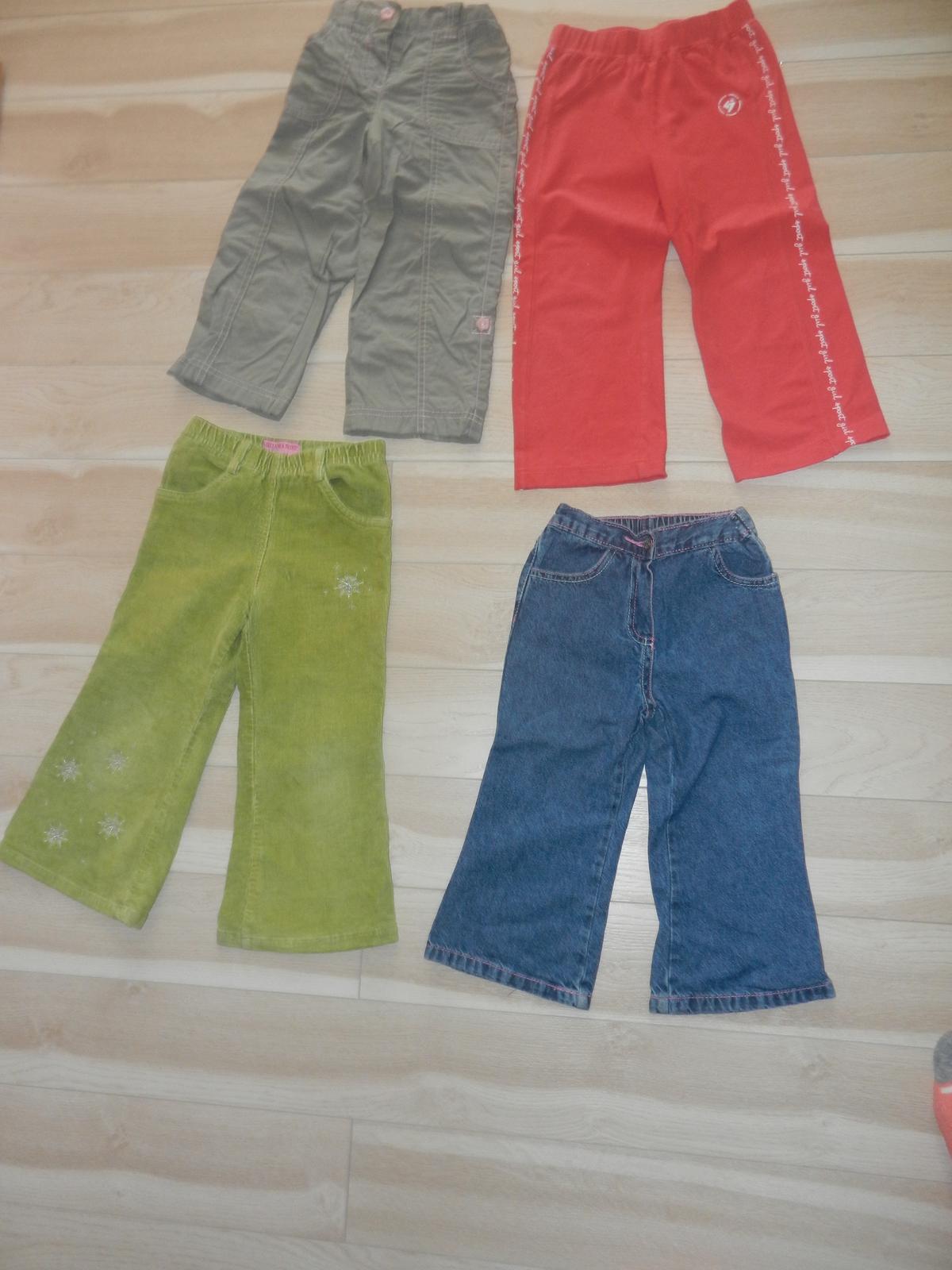 cena spolu, dobry stav cervene teplaky uz niesu, samostatne modre rifle dole vpravo dlzka je 58cm, vnutorna 42cm, pas v nenatiahnutom stave 24cmx2, natiahne sa do 29cm, je na nich regulovatelny pas na gombik,cena 2,50€, sede 3,90€,zelene menzestraky 2,€