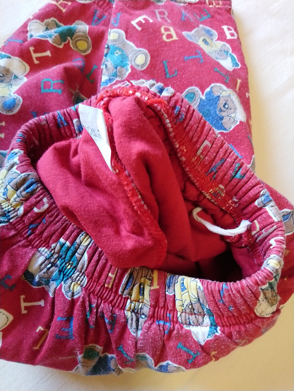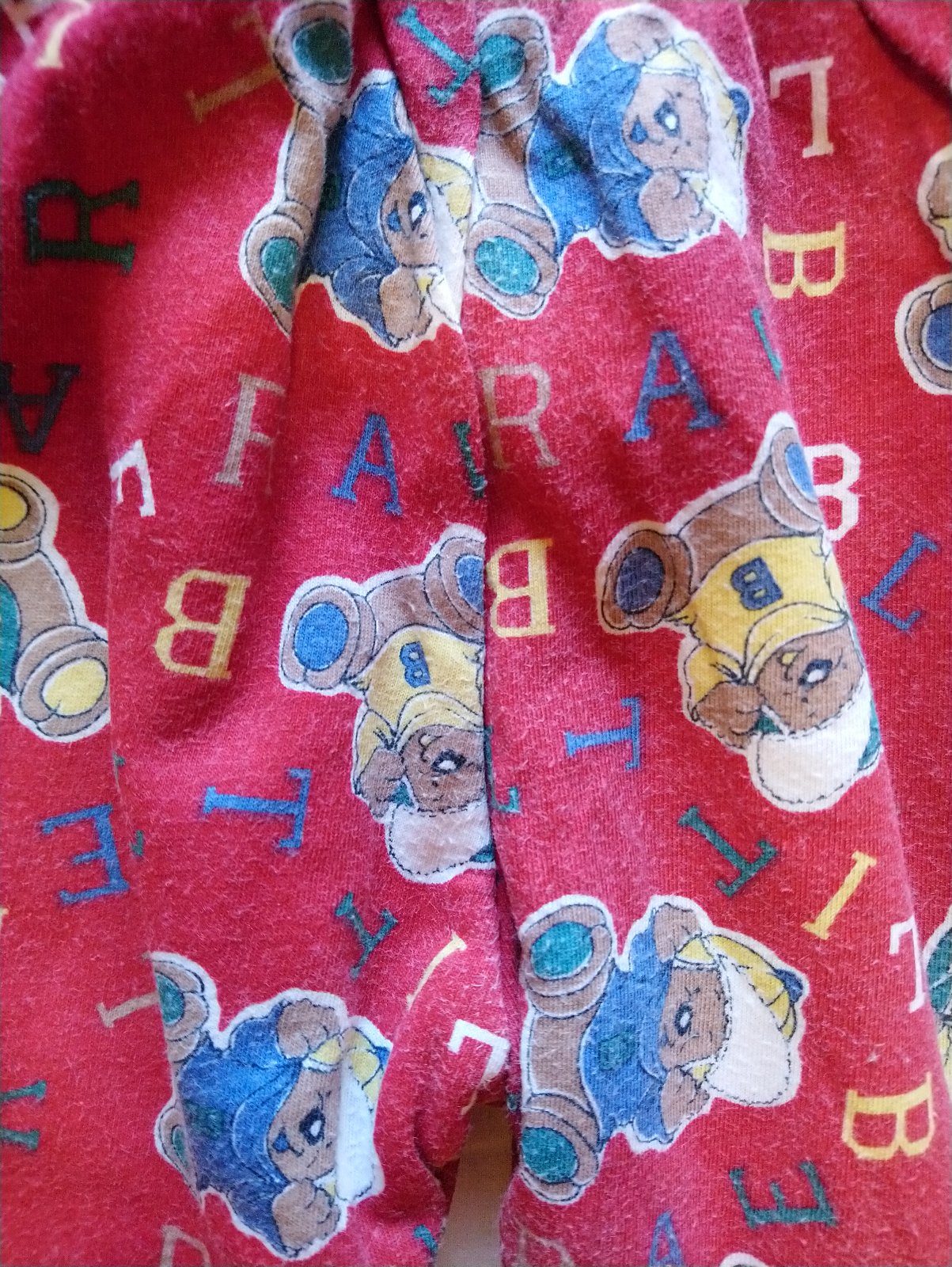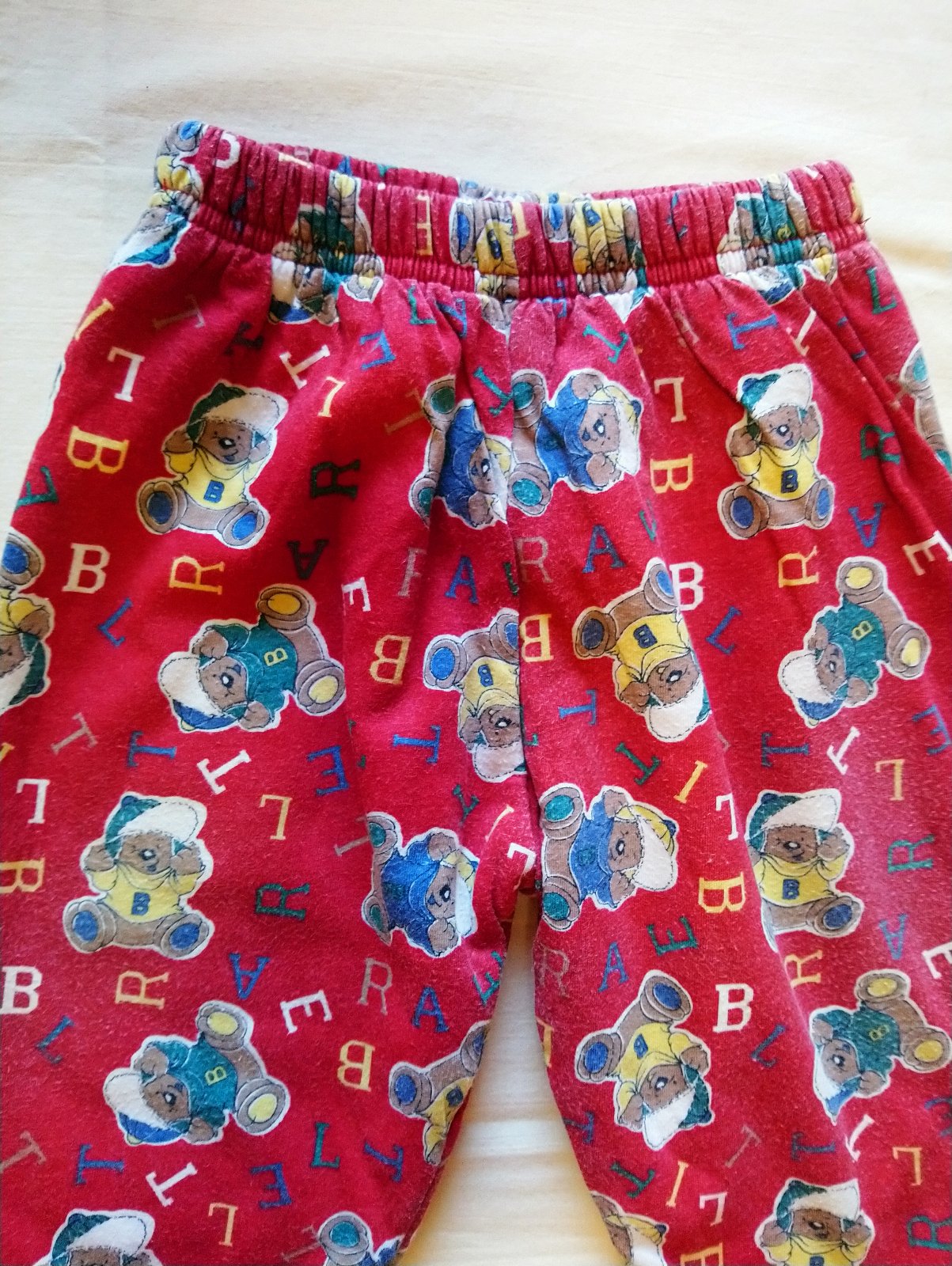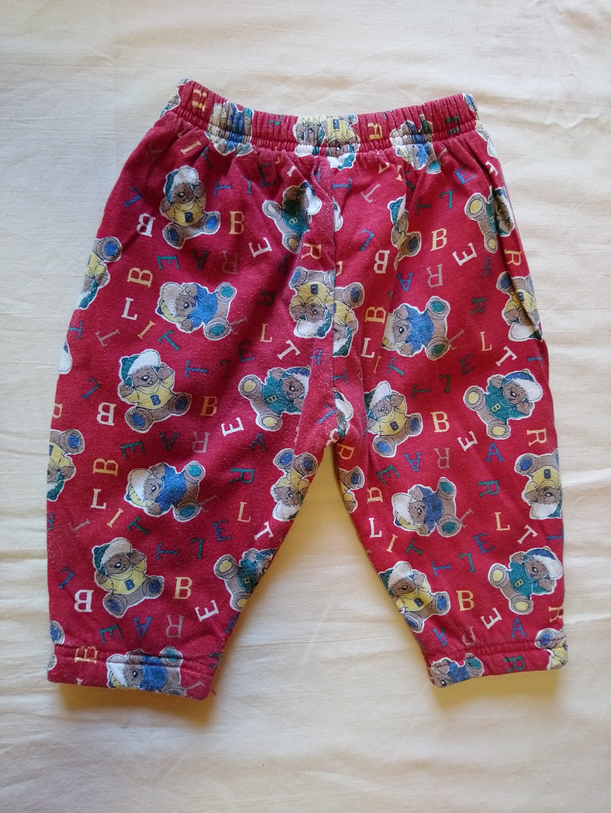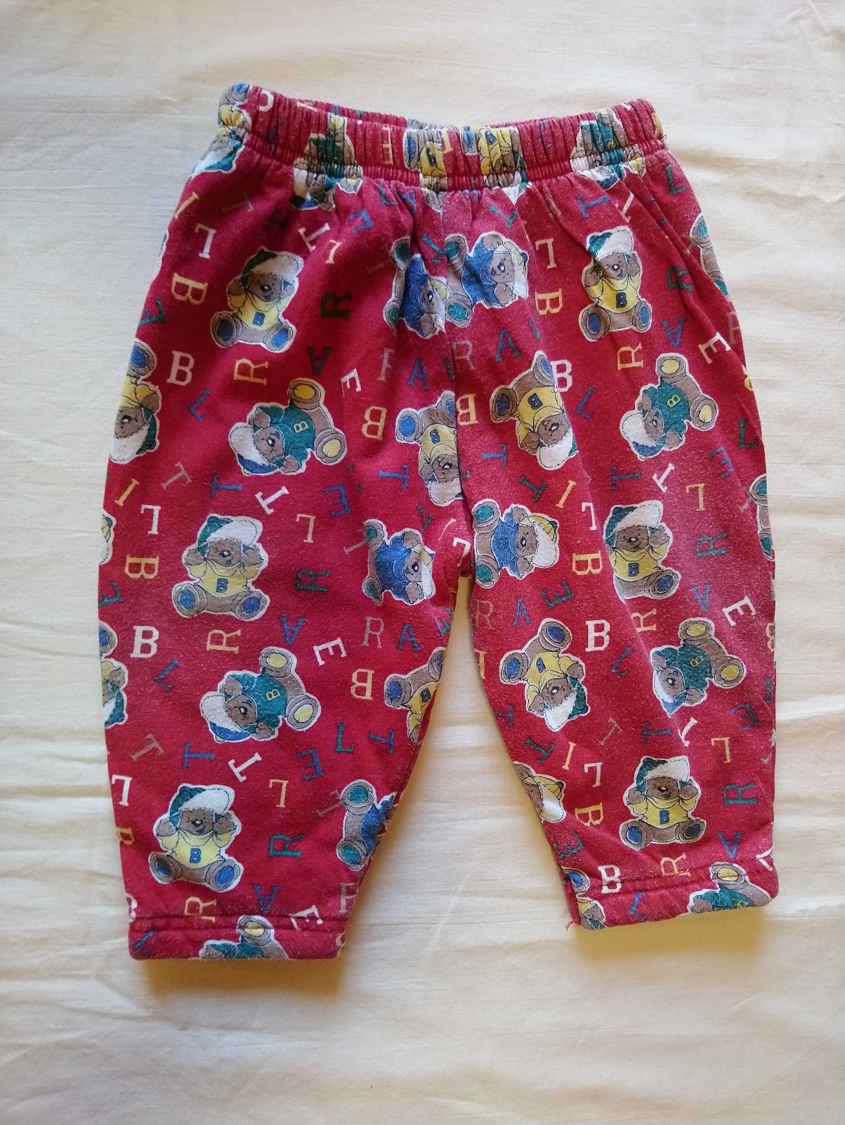 veľkosť 68 cm, červené zateplené nohavice v páse na gumu s farebným motívom mackov, stredne zateplené a podšité, v nosenom stave, mierne známky prania, nosenia, príjemný kvalitný materiál 100 % bavlna.