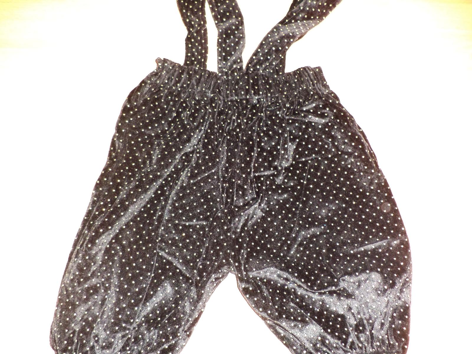 Čierne zamatove nohavice zo zlatymi bodkami ,vzadu v pase guma ,na traky ktore sa daju prispôsobit,nohavičky su zakončene do patentu , môžu byt aj ako 3/4 celkova dlžka 47cm od sedu 22 cm pas 42cm až 55cm