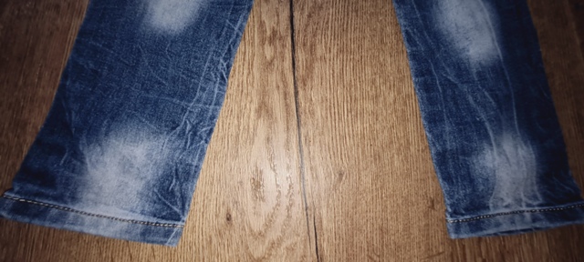 úzke, efekt vyšúchania po celých nohaviciach, pás na gumu, ozdobné vrecká vzadu, vpredu 2 vrecká, zloženie bavlna + polyester + elastan, perfektný stav