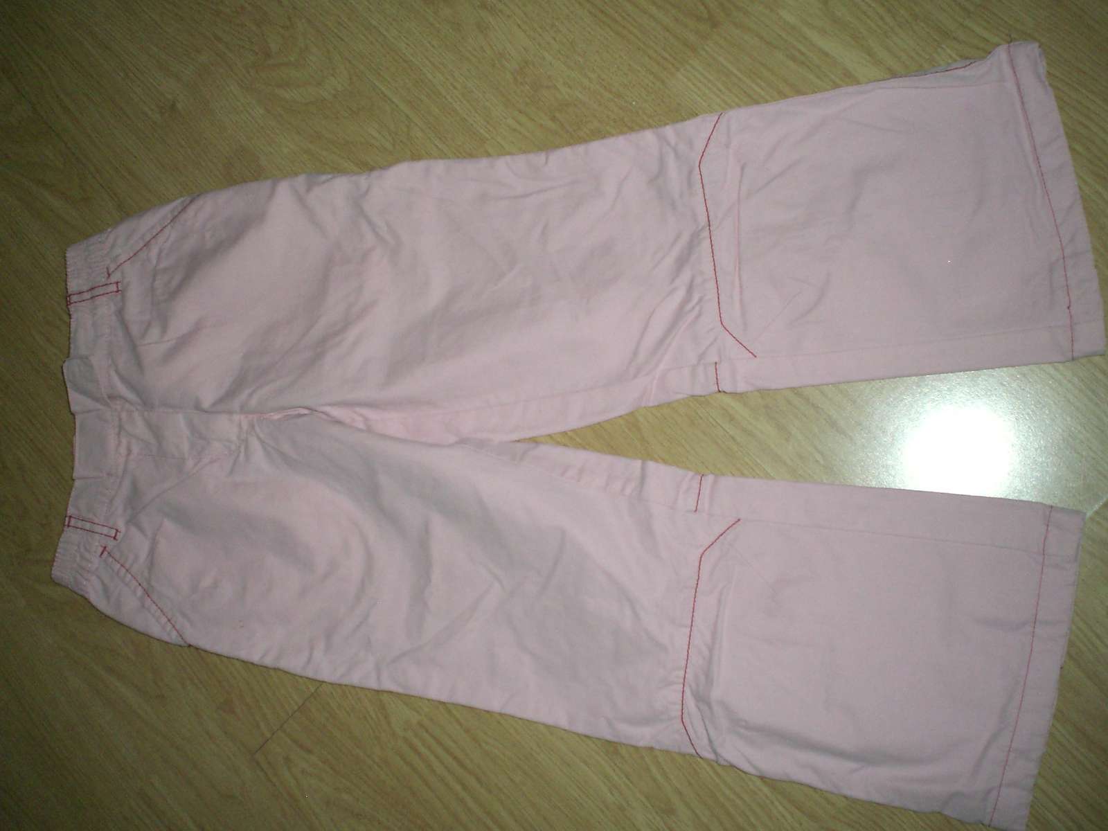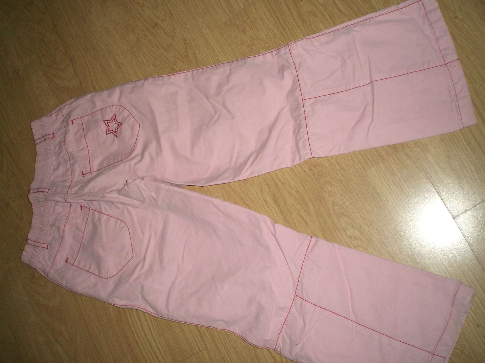 Peknučké nohavice, len trošinku ošúchané spodky, ružové prešívané červenou nitkou. V zadnej časti pásu gumička.