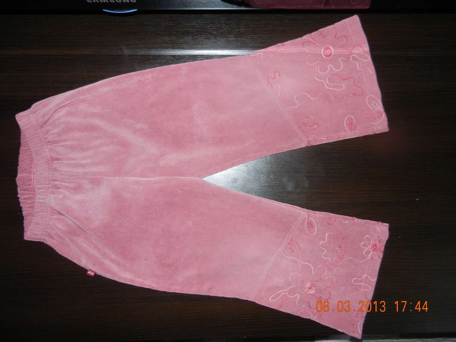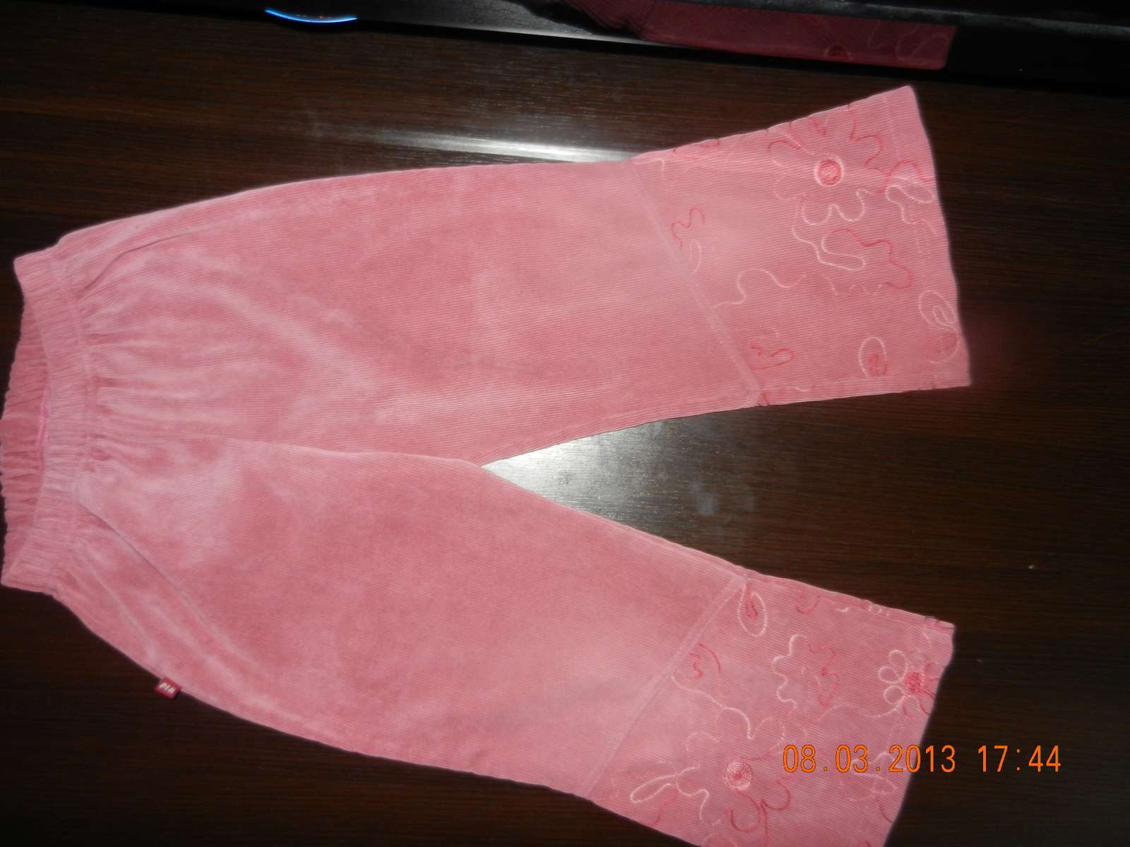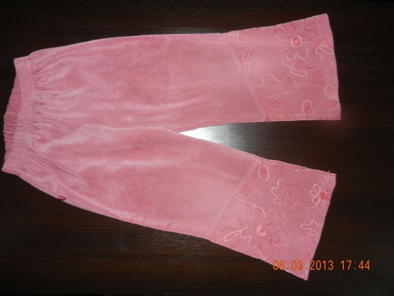 dolu vysivane kvietky, farba nieco medzi lososovou a ruzovou. pas je na gumicku da sa natiahnut do 36cm, dlzka 58cm, od rozkroku 38cm. nosene, dobry stav, nevysuchane spodky, bez flakov, bez dier