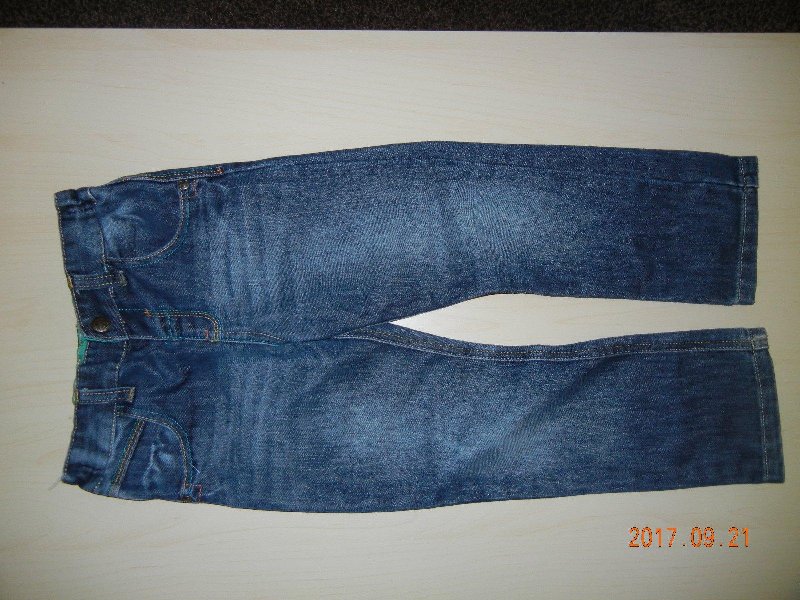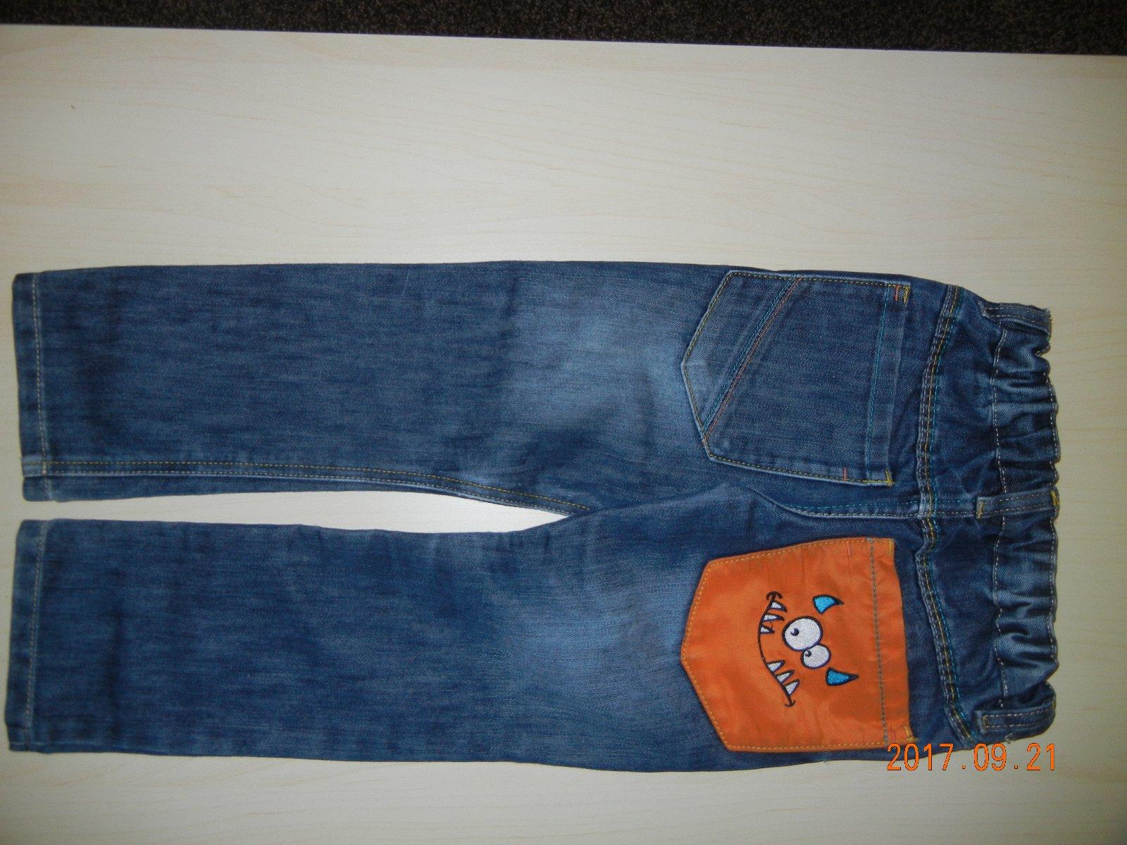 Predám riflíky s ksichtíkom na zadnom vrecku, nosené, ale bez poškodené, fľakov, dier, žiadne vyblednuté a zelené kolená. Rozmery: dĺžka: 65cm, šírka pásu: 2x27cm, v páse funkčná gumka