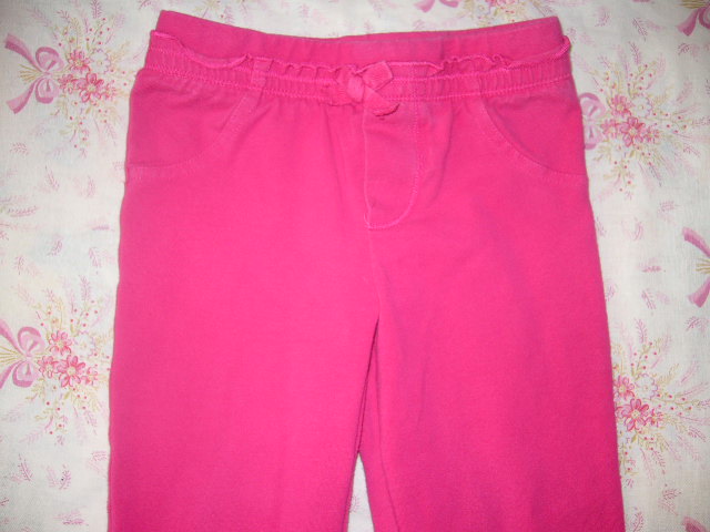 Znackove teplačiky peknej sytej cyklamenovej farby.Vôbec nie su vyblednute,ani nemaju žmolky.Pas je zapracovany do 4cm sirokej gumy,v klude meria 23x2 napnuty 26x2.Boky 26x2.Dlzka 49cm. 92% bavlna.