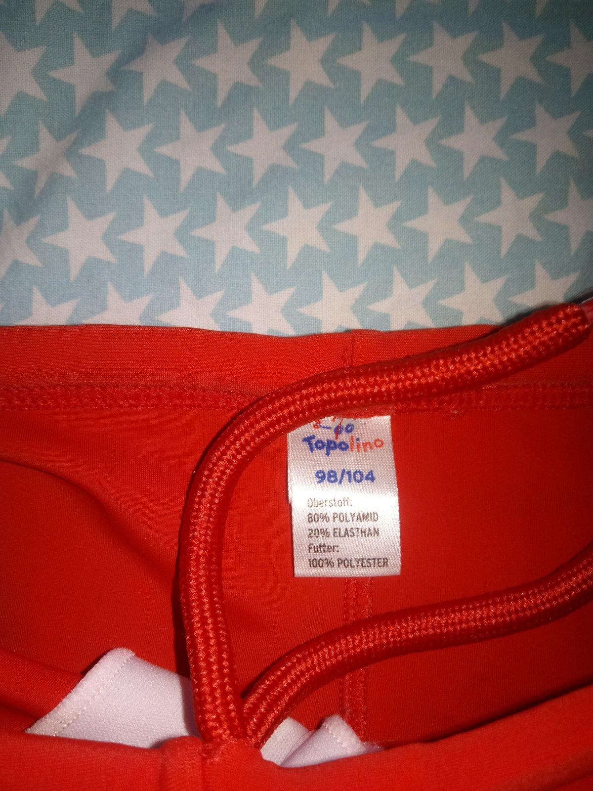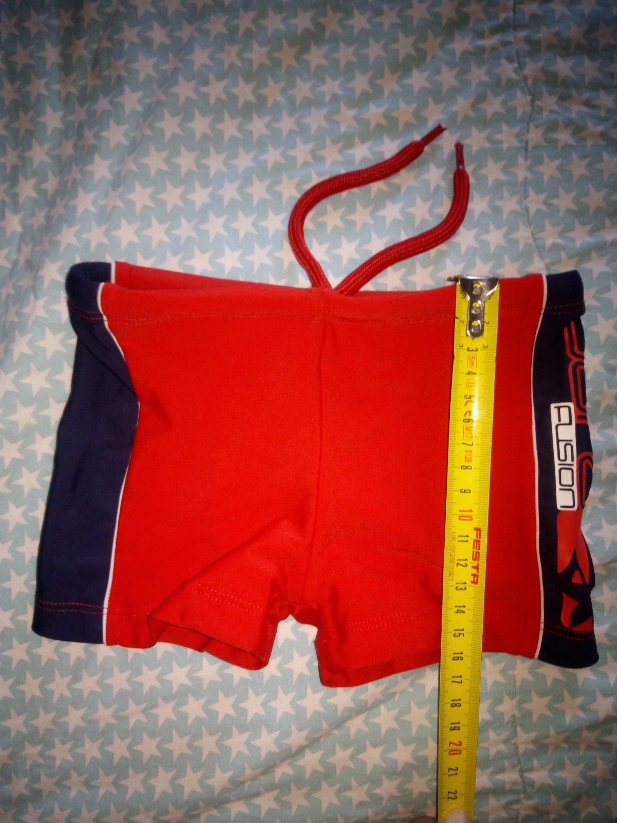 Jeden alebo dvakrát oblečené plavky. Pás sa upravuje šnúrkou. Písané dvojčíslo 98/104 ale skôr 98.