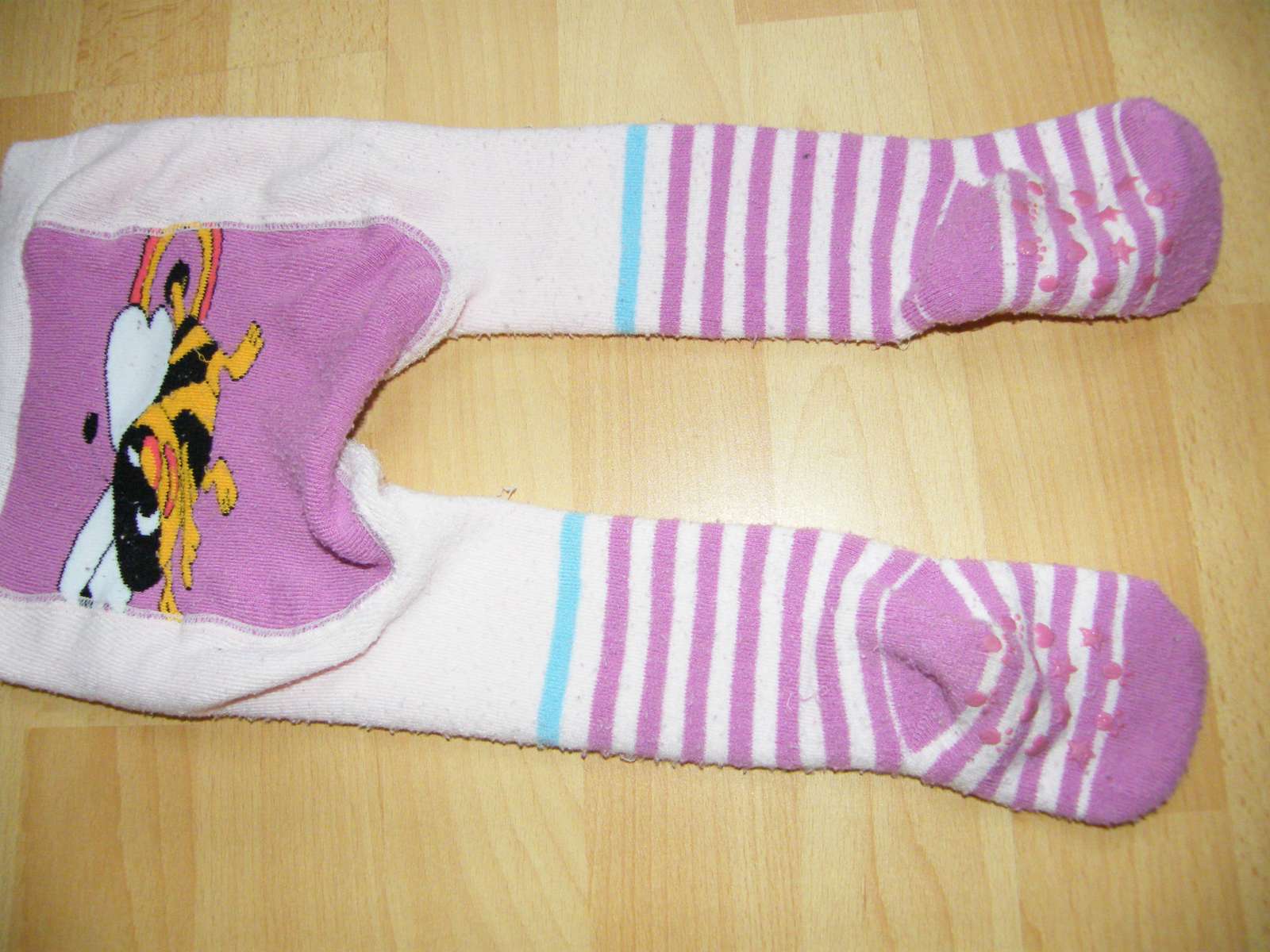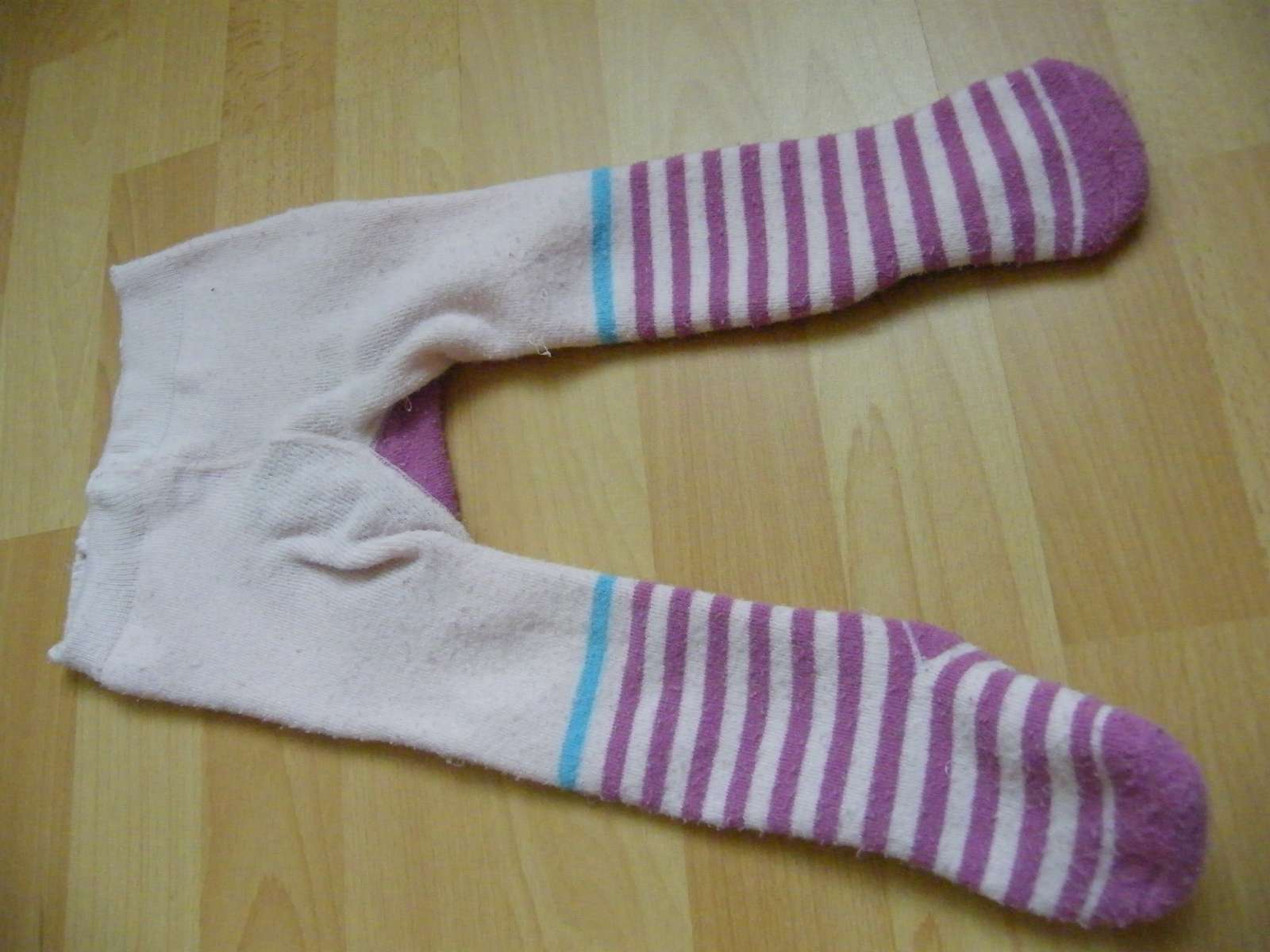 bežné známky nosenia - žmolky a trošička roztiahnuté na zadku, ale sú super teplučké, tak snáď ešte poslúžia, veľkosť 68/74.