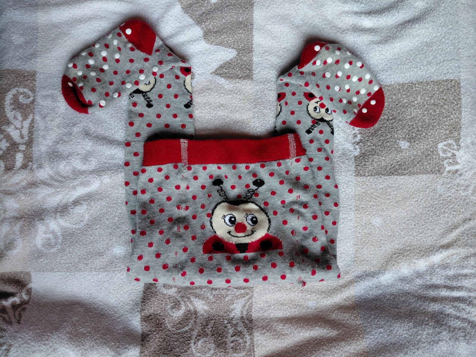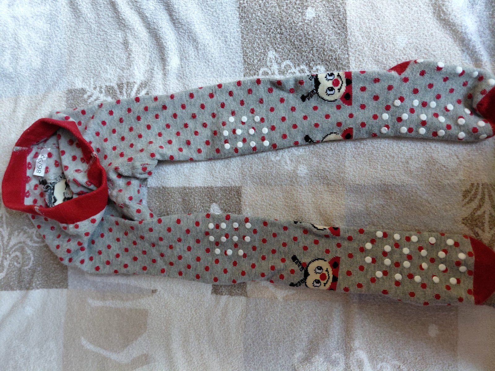 Veľmi pekný stav, po 1 dieťati, málo nosené. Nie sú tuhé ani úzke, protišmykové chodidlá a kolená. Dĺžka v pokojnom stave 45 cm (merané od päty), chodidlo v pokojnom stave 13,5 cm.