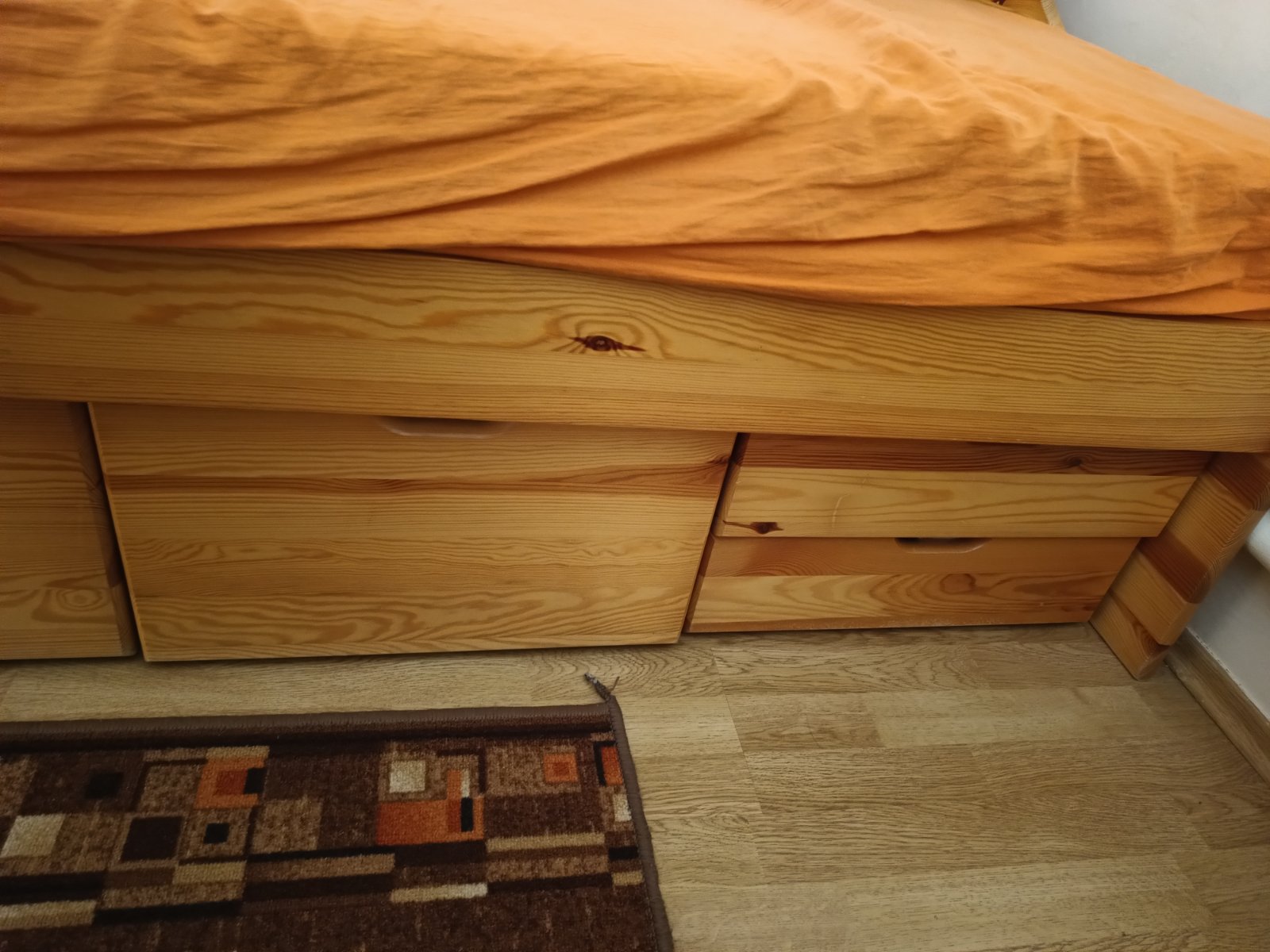 Jednolôžková posteľ bez matracu, v dobrom stave. Dole sú úložné priestory - 2 malé, 1 stredný a 1 veľký šuflík. Rozmery sú 205x100 cm