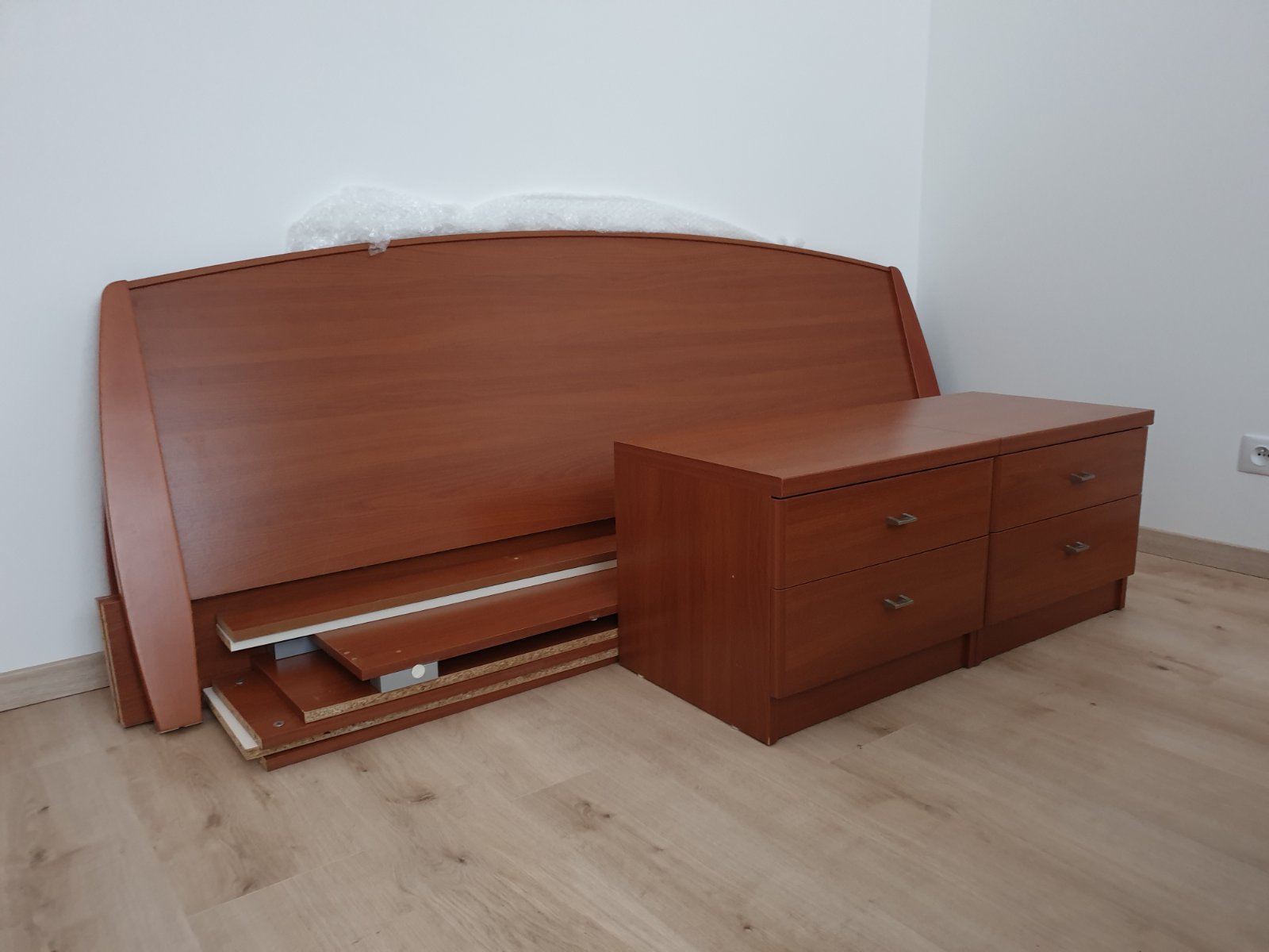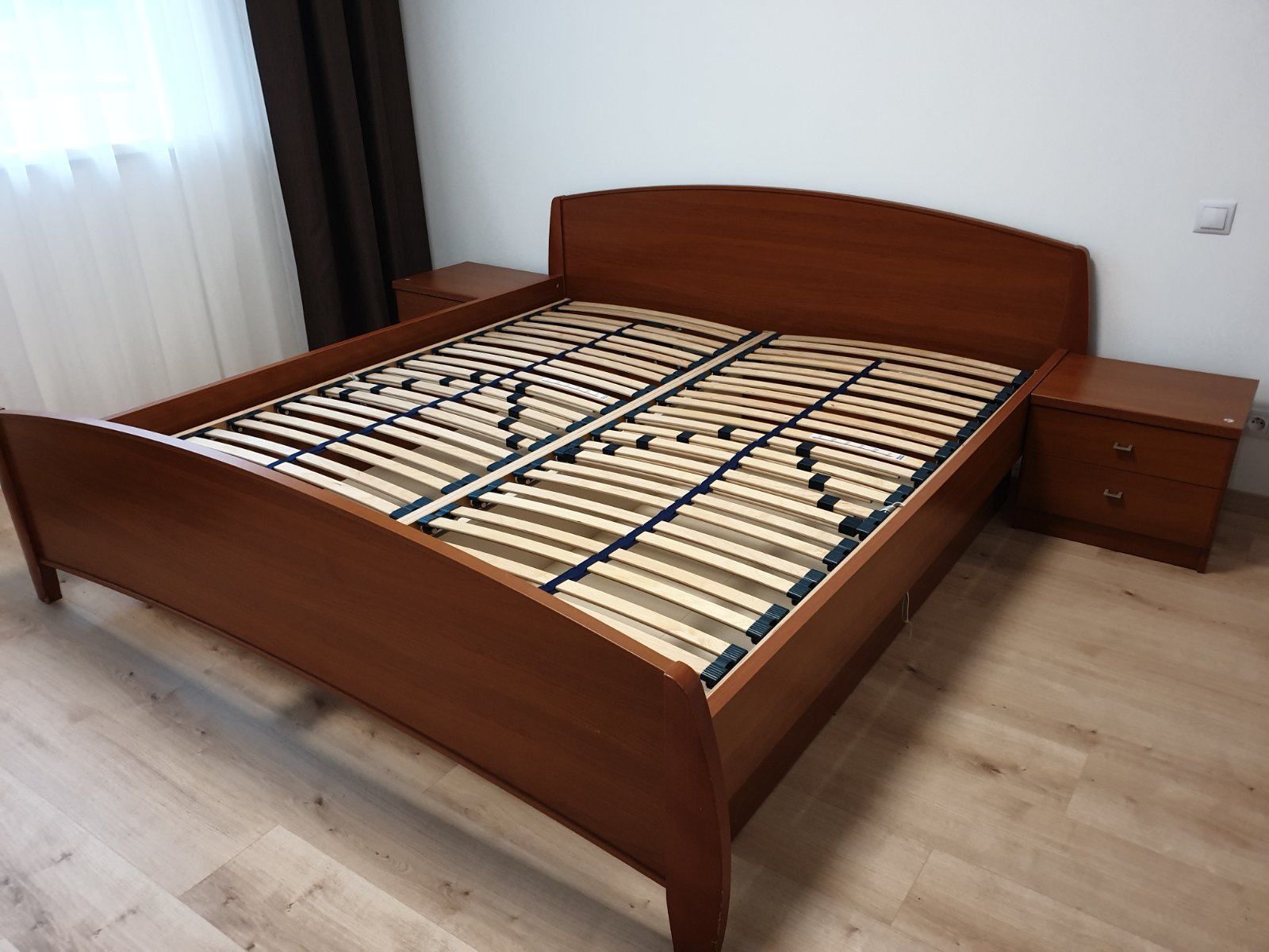 Predám manželskú posteľ s úložným priestorom a dvoma nočnými stolíkmi. Bez roštov. K posteli sú aj kovové výklopné kovania. Posteľ je demontovaná.