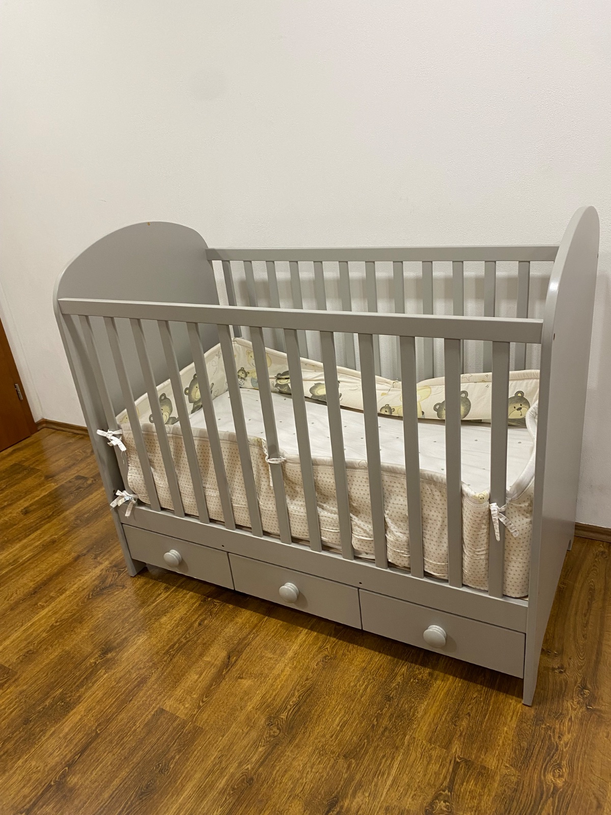 Predám detskú postieľku sivej farby s 3 šuplikmi. Postieľka bola kupovana v Ikey. Da sa nastaviť do 2 polôh, kde matrac je v strede postieľky (novorodenec- foto č. 2) a potom na najnižšiu polohu… Z obidvoch strán sú zábrany, ktoré sú na pevno, keď už je vacsie dieťa, je možné tu stranu nad suflikmi zložit a pridať postrannú dosku (nie je na foto doložím pri kupe). Súčasťou postieľky je matrac o rozmeroch 120 cm x 60 cm (bol chránený nepremokavou plachtou) + pribalim mantinel / chránič okolo matraca medvedikovy a taktiež pribalim 2 ks dečiek (snoopy - vid foto) , ktoré sme používali aby si dieťatko nebuchlo hlavičku. K prvej polohe- je súčastou aj biely zaves pod matracom -vid foto. Šupliky sú plne funkčné a veľmi praktické. Postielka je bez poškodenia len má jednu malú chybičku čo nebráni používaniu a to, že na čele je trochu zlupana sivá farba ( vid foto). Postieľka je zatiaľ v nerozloženom stave. My sme boli s postieľkou veľmi spokojní. Iba osobný odber po dohode.