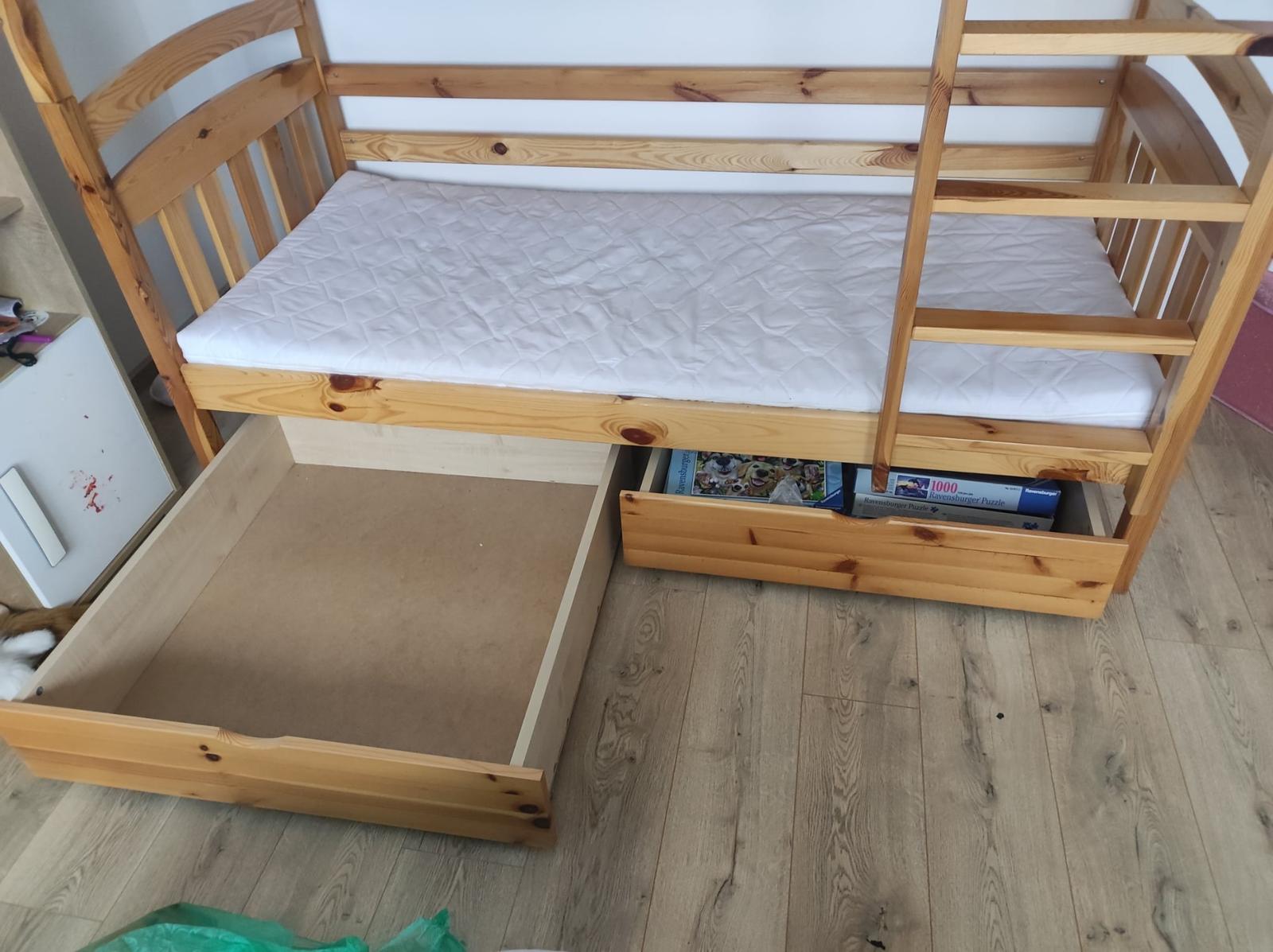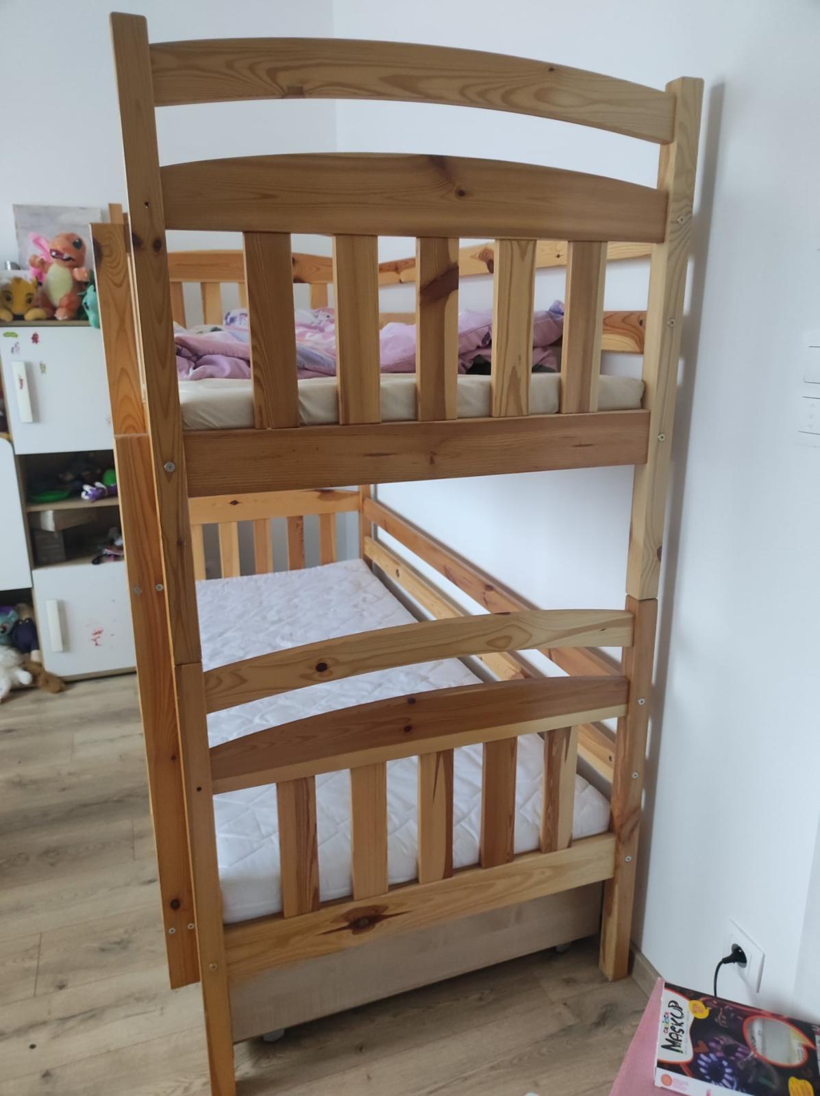 Predám detskú poschodovú posteľ z pevného dreva 188 x 170 x 87 cm s madracmi. Rozmer lôžka 180 x 80 cm. Rozložiteľná na dve samostatné postele, s dvoma úložnými šuflíkmi na kolieskach...
