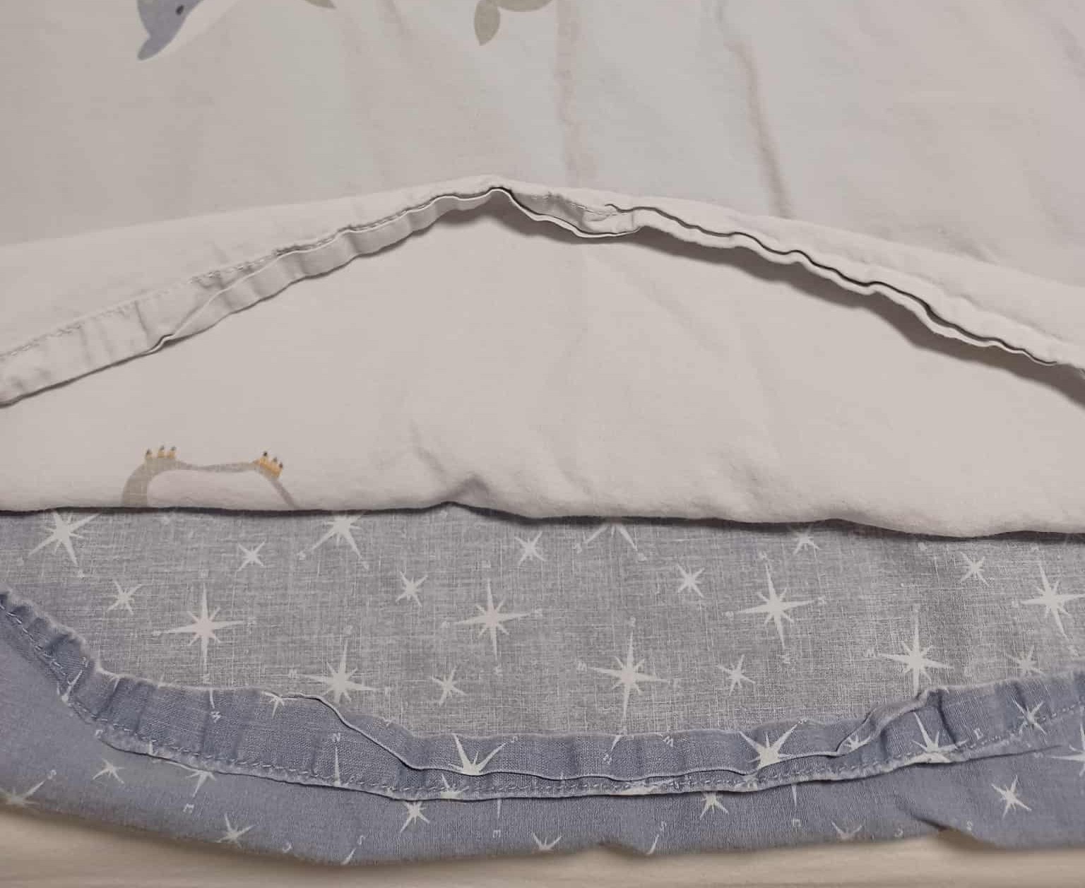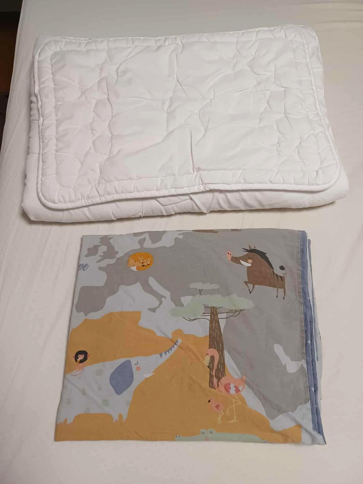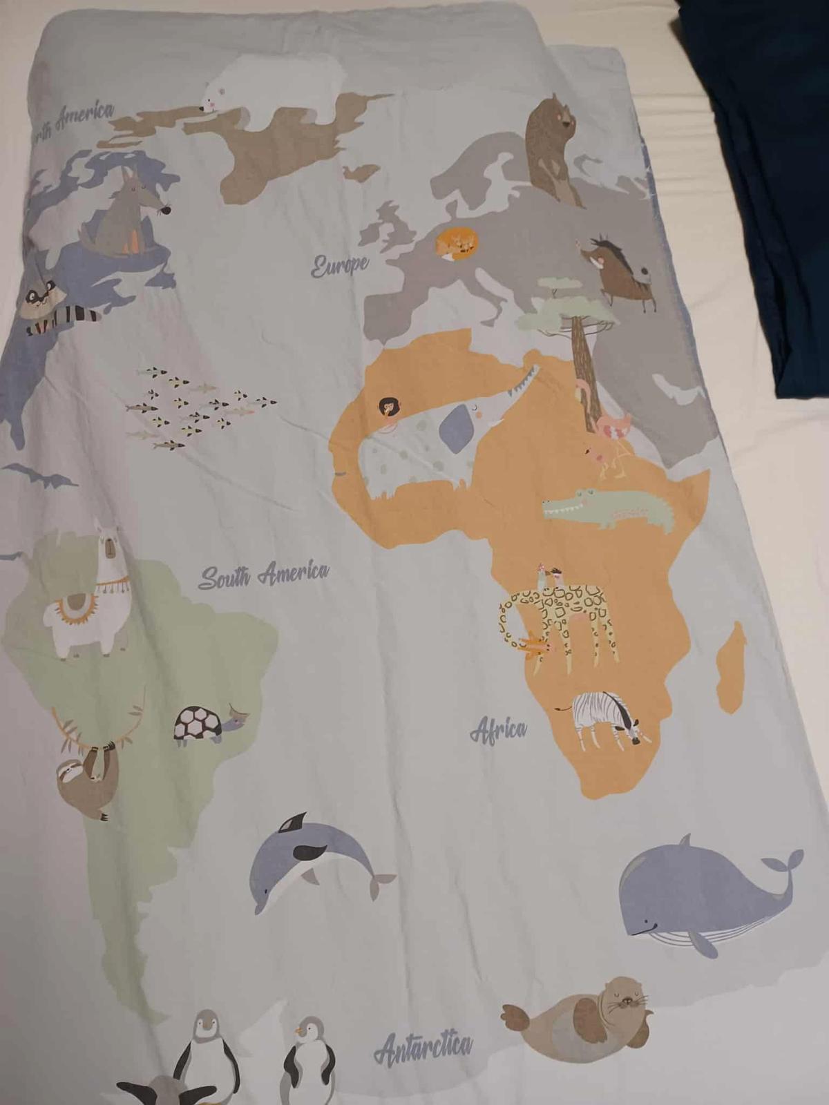 Obliečky - obojstranné. Na jednej strane "hviezdy", na druhej strane "svet so zvieratkami). Farby trochu vyblednuté a na obliečke vankúša je 1 roh trochu rozpáraný (detail foto)