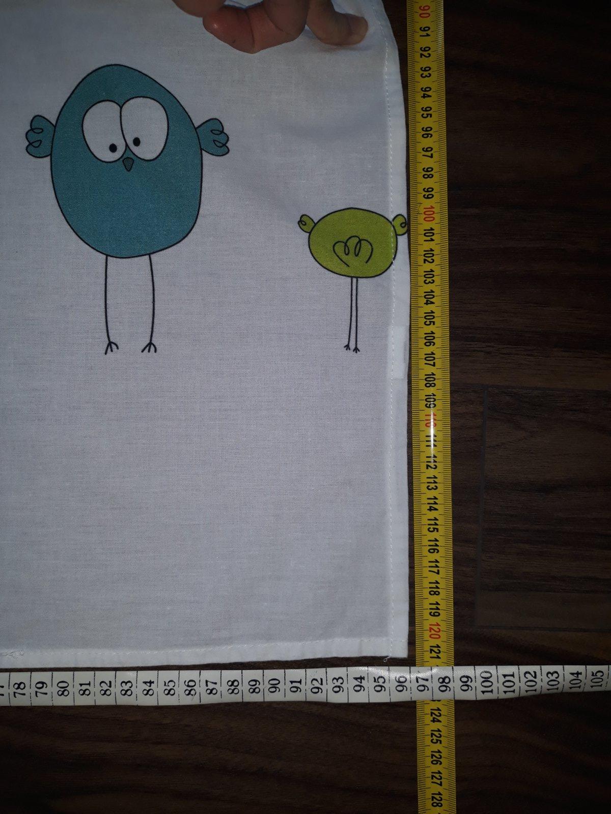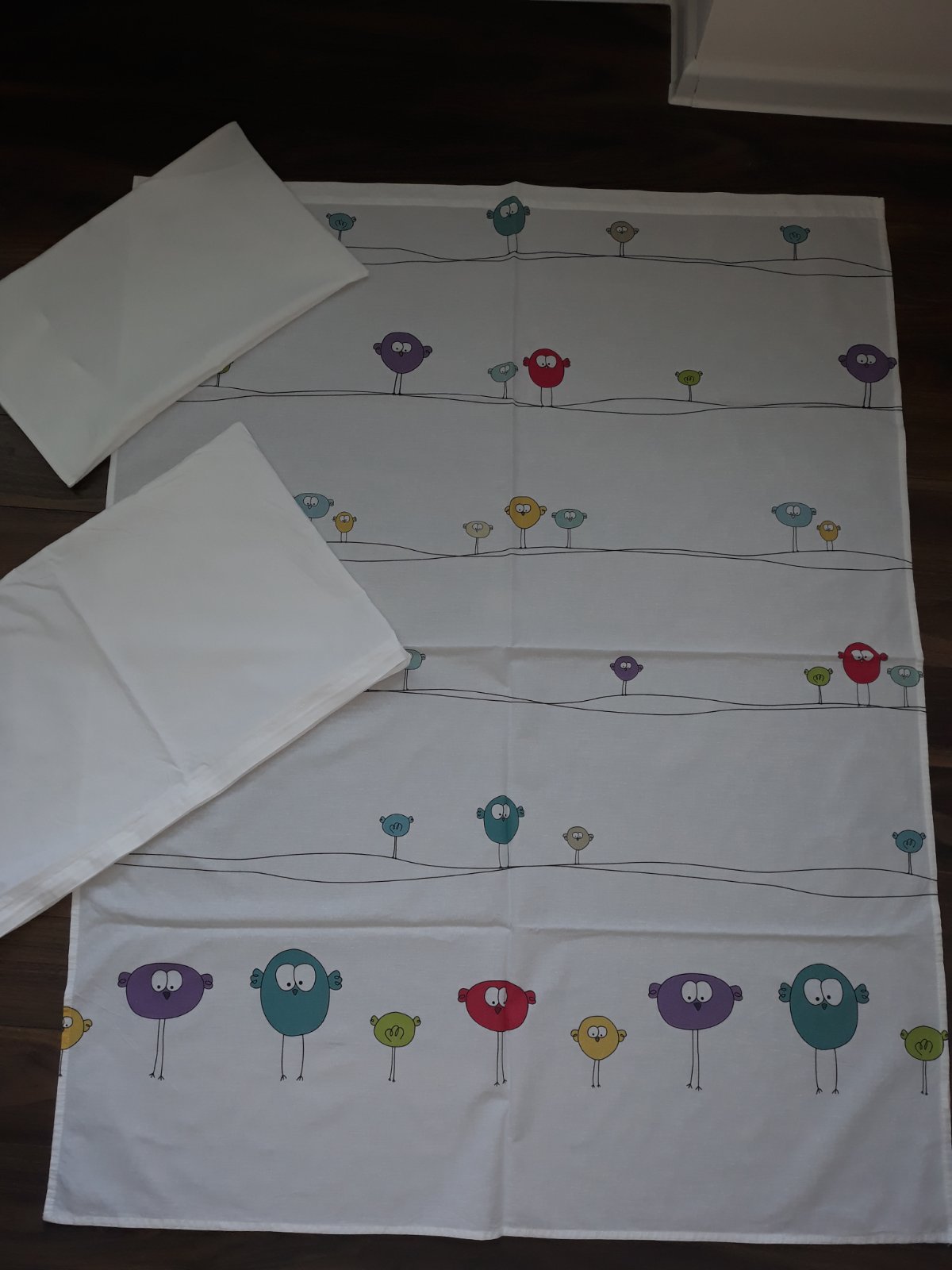 Set pozostáva z plachtovej prikrívky s vtáčikmi a z obliečok na vankúše. Originál bola k tomu obliečka na hotelový sklad, ktorá nebola používaná, lebo nám nesedel rozmer - napriek tomu sa jeden rožtek pára. Došívala som k tomu obliečku na zips, na vankúšik klasického rozmeru 40x60 cm.