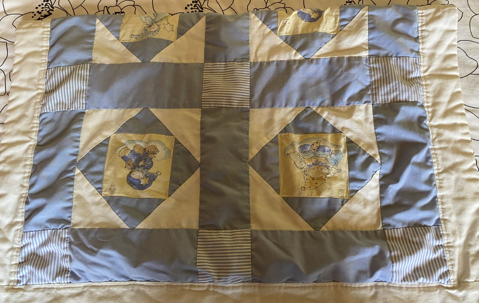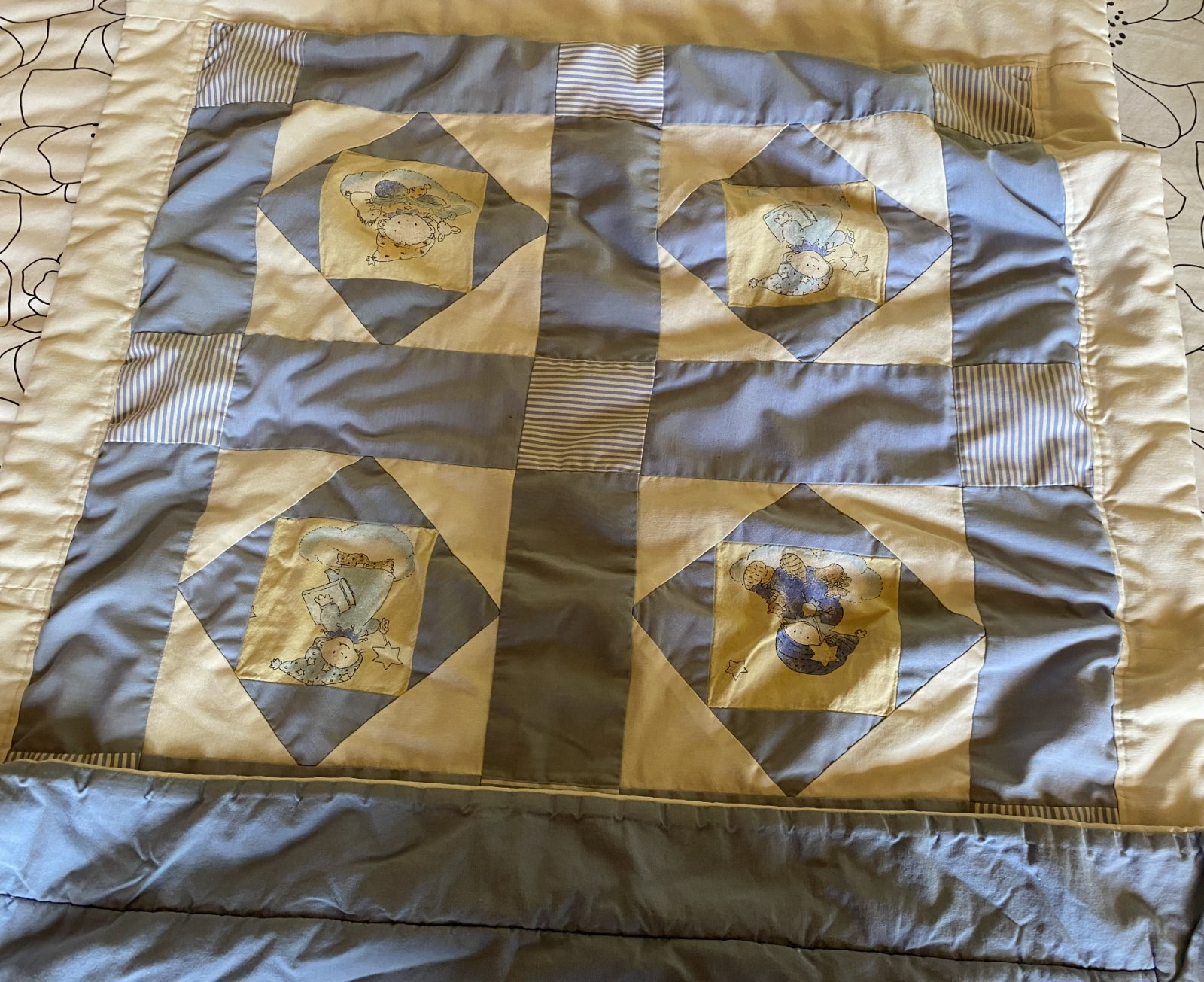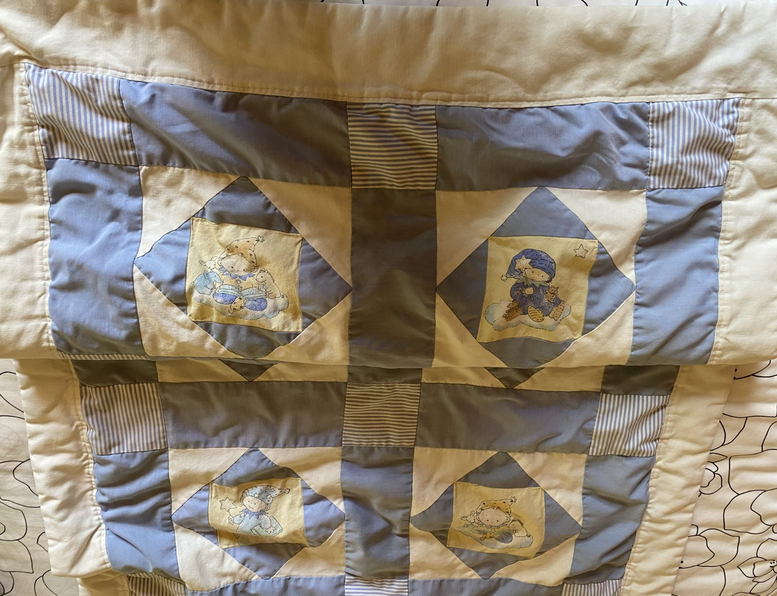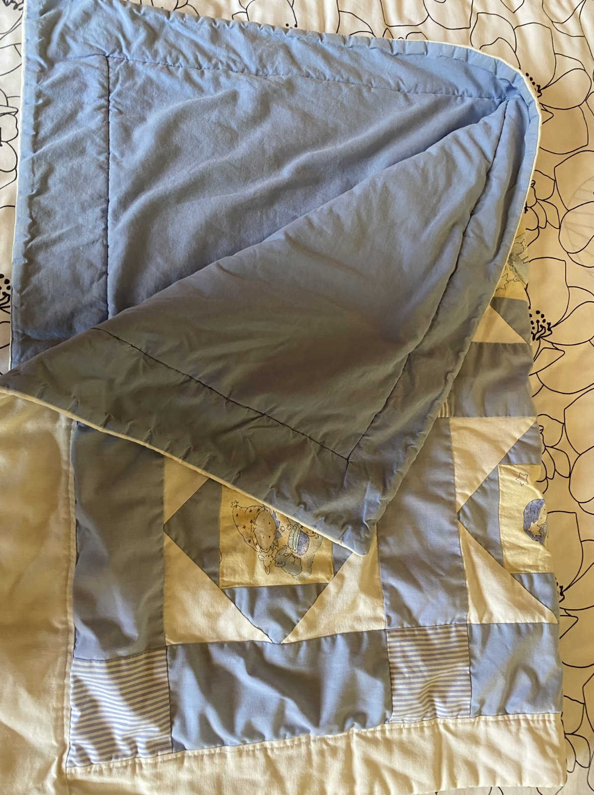 Prešívaná detská prikrývka paplón, kvalitne preprcovaná, z jednej strany prešívaná - patchwork - viacfarebná, z druhej strany bledomodrá, vo vnútri zateplenie, málo používaná, na striedačku s iným. Miery: 80x115 cm.