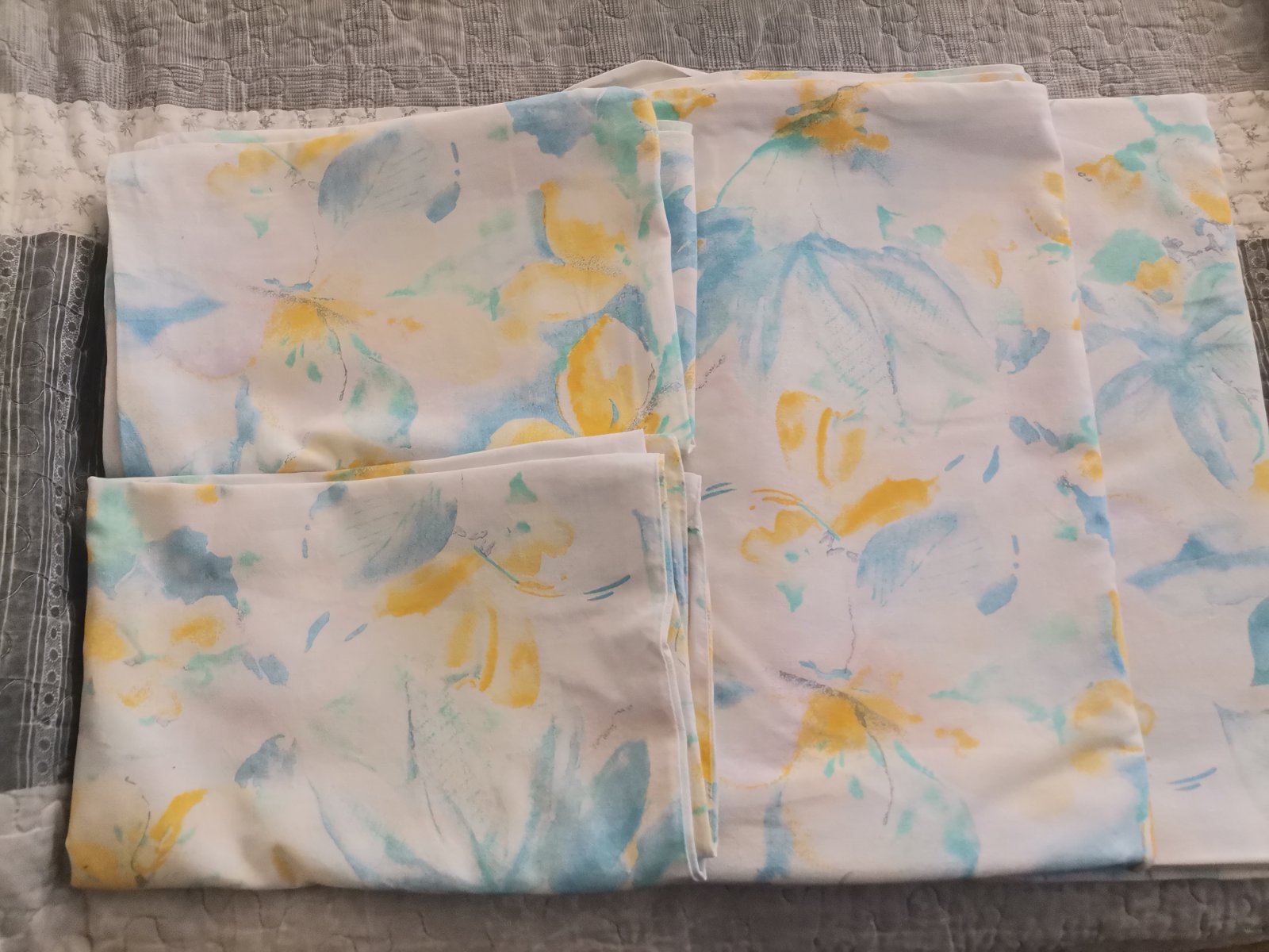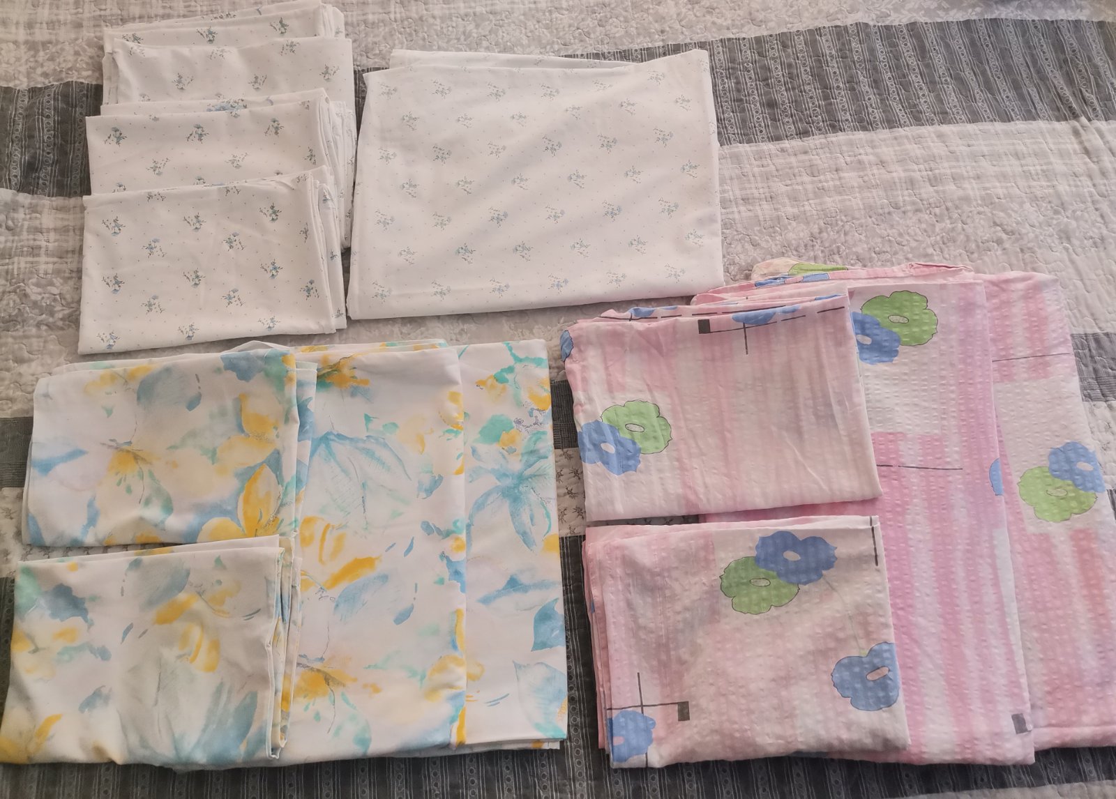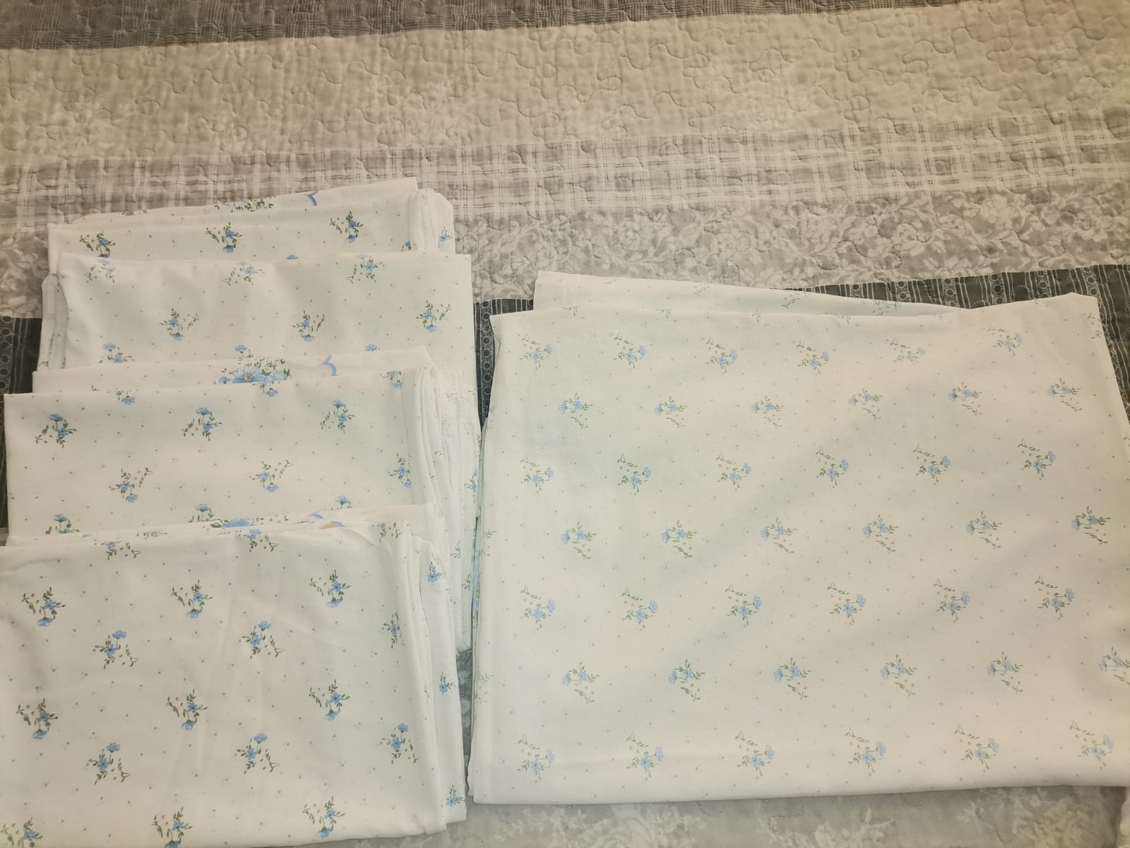 Biele s modrými kvietočkami: 1ks veľká obliečka +4x vankúš veľký.