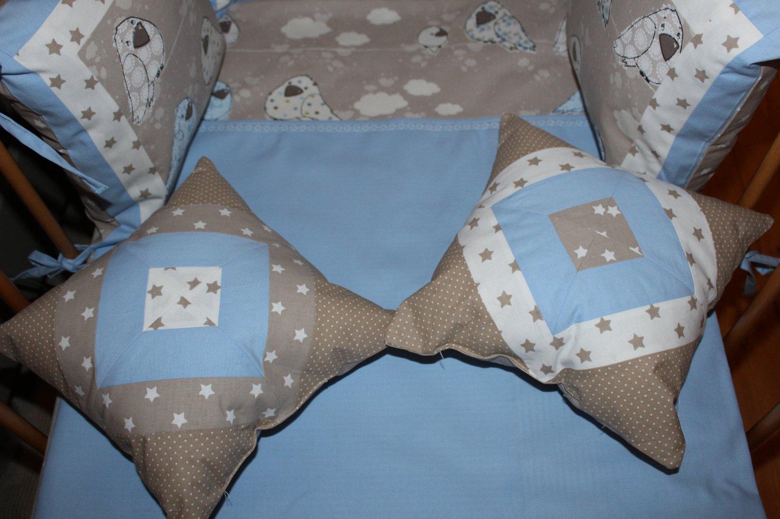 Komplet do postieľky, hniezdo a obliečky dozdobené strojovou výšivkou a dekoračné patchwork vankúšiky. Výrobca Coccinella-Patchwork
