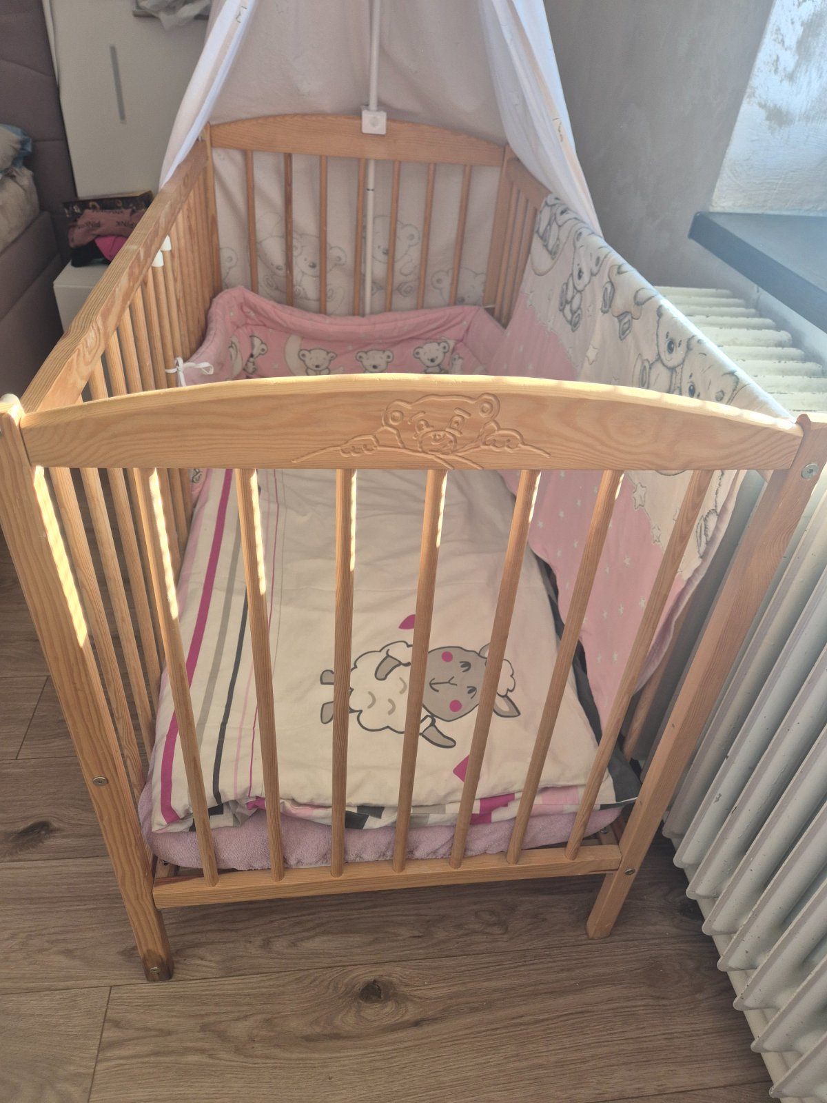 Predám detskú postieľku bola kupovaná nová je teraz po jednom dieťati,postieľka je v poriadku,predávam ako celok,má 3 polohy,2 tyčky sú vyberateľné,je k nej stojan na baldachyn,baldachyn,2xmatrac,nepremokavá plachta,plachty,poduška a paplón,mantinel okolo postieľky,návliečky nájde sa na jednych sem tam fliačik ale inak bez poškodení,cena 50€ (osobný odber) okolie Trencina viem doviesť
