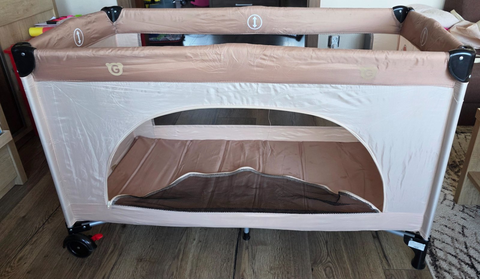 Cestovná postieľka je praktická, bočná strana sa dá odopnúť, dieťatko tak môže pohodlne liezť z postieľky aj do postieľky. Sieťované steny umožňujú lepšie sledovanie dieťatka.