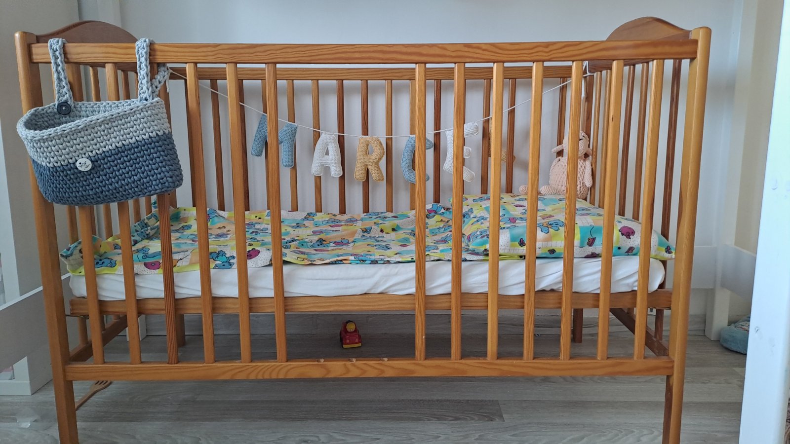 Drevenna postielka bez chyb s matracom aj s bielou plachtou.Da sa prisposobit na dve vysky a ked je dietatko vacsie daju sa vybrat 3 stredove tycky ( vid foto) aby mohlo vychadzat.
