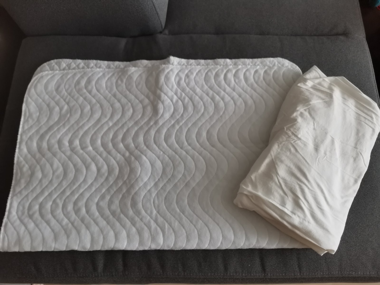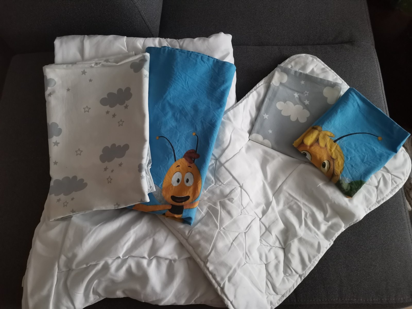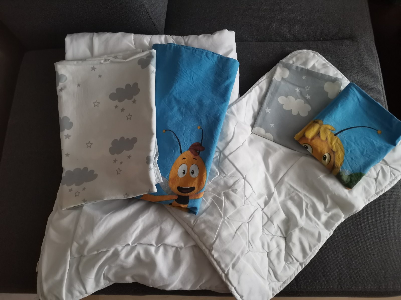 Posuniem ďalej súpravu do detskej postieľky. Vankúšik a prikrývka spolu s dvoma sadami obliečok,jednou plachtou a nepremokavou podložkou jej rozmery sú na fotke. Všetko spolu.