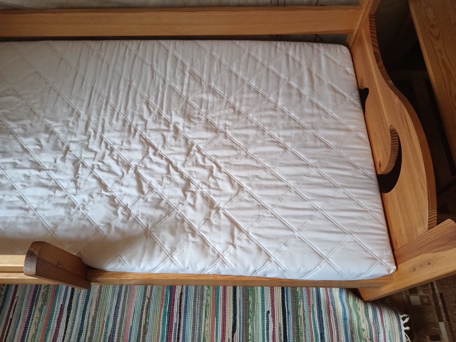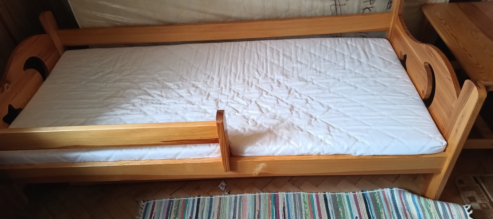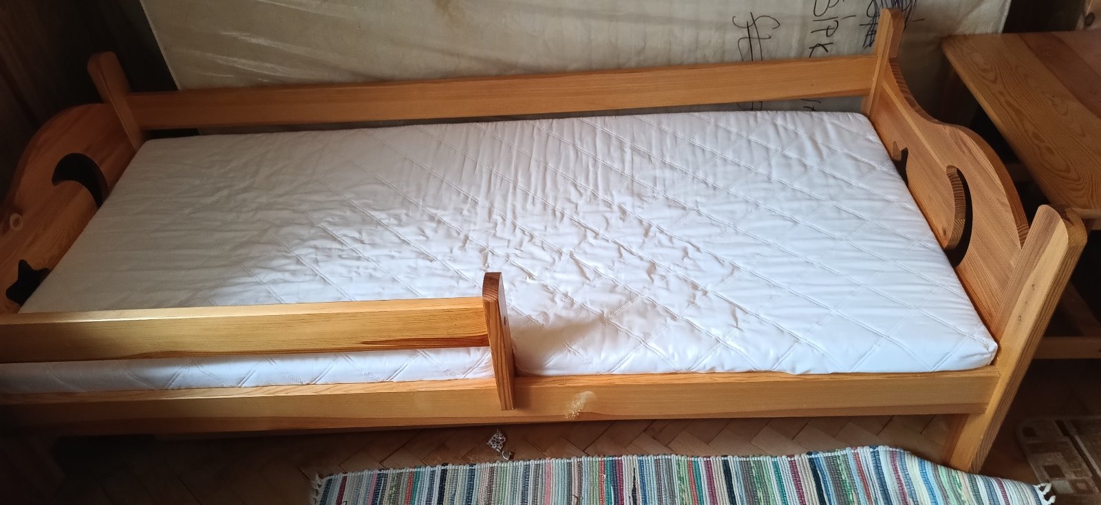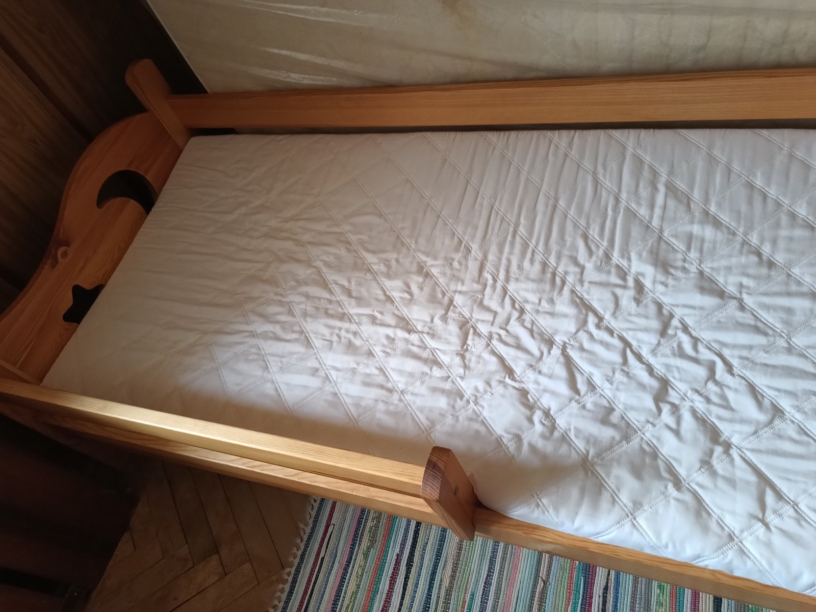 Drevená posteľ 180x80cm. Bola to jedno poschodová posteľ ktorá bola neskôr znížená na klasickú posteľ. Mám k nej aj matrac používaný cca 3 roky. Vrchná časť sa dá prať. Matrac je s pohánkou a koko...