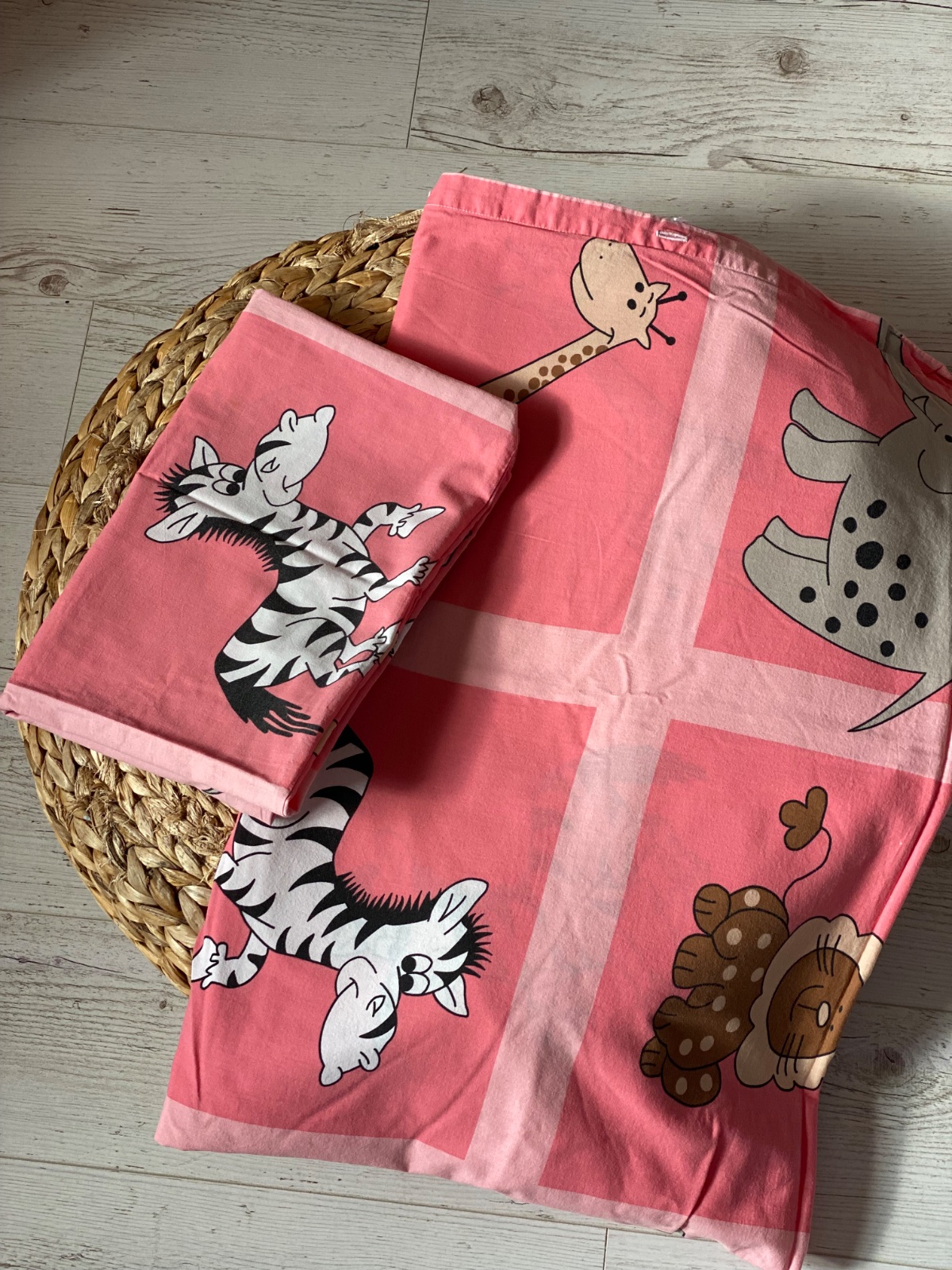 Postelne prádlo 100% bavlna, prijemne, pranie na 60. Vankúšik sme trochu využili, obliečka na perinku je úplne nová, nepoužívaná. Rozmery: obliecka na vankúš - 34x55 cm, obliecka na perinku - 107x1...